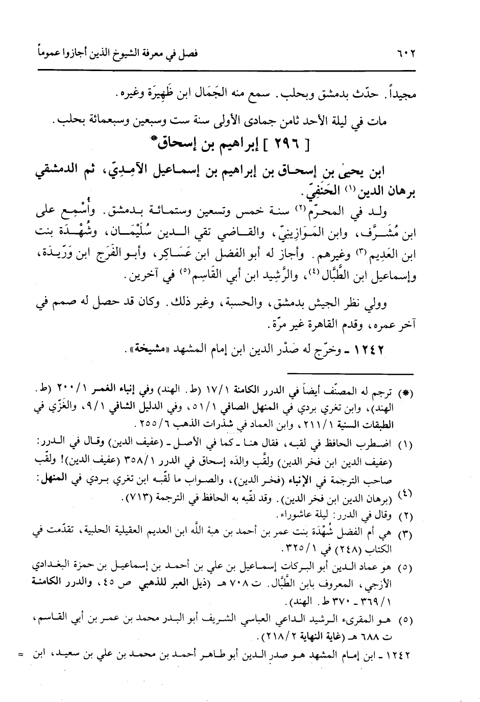 [296] إبراهيم بن إسحاق ابن يحيى بن إسحاق بن إسماعيل الآمدي ثم الدمشقي برهان الدين الحنفي ولد في المحرم سنة خمس وتسعين وستمائة بدمشق واسمع على ابن مشرف وابن الموازيني والقاضي تقي الدين سليمان وشُهدة بنت العديم وغيرهم.