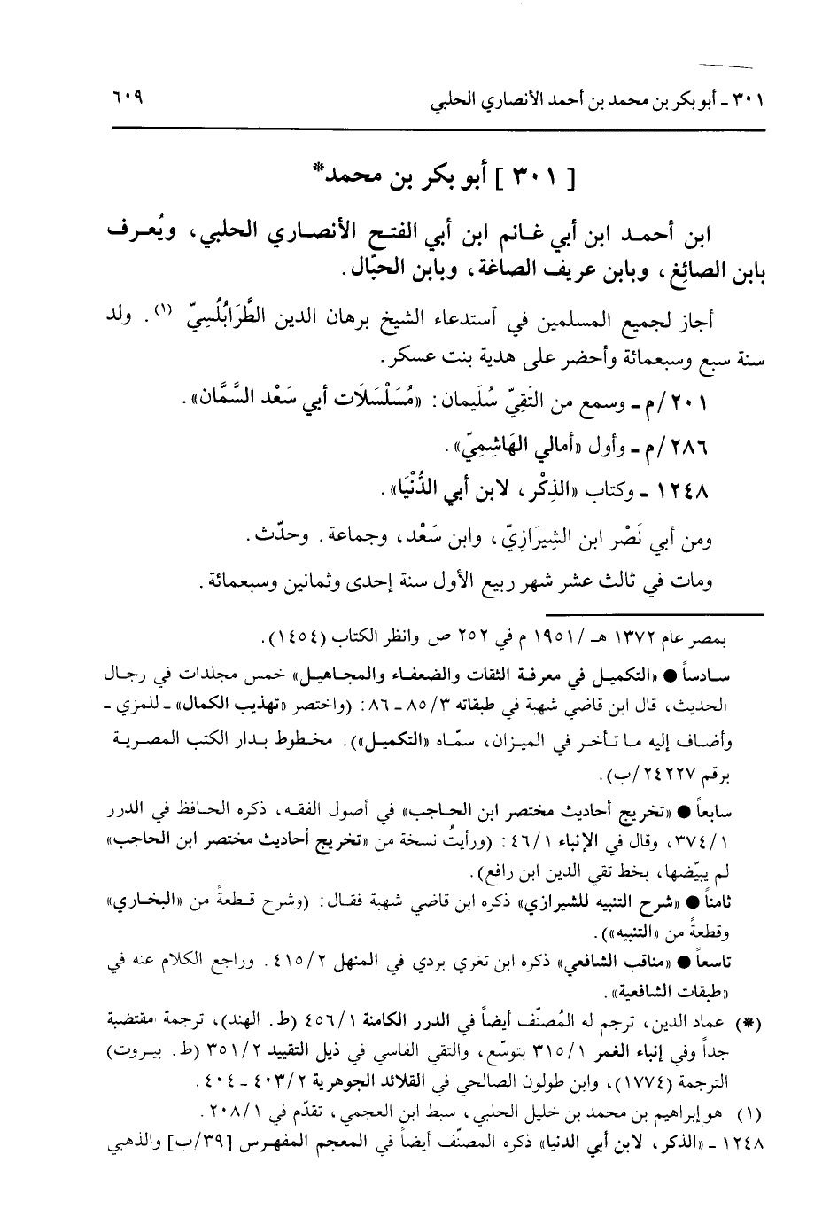 [301] أبو بكر بن محمد ابن أحمد ابن أبي غانم أبي الفتح الأنصاري الحلبي ويعرف بابن الصائغ وبابن عريف الصاغة وبابن الحبال.