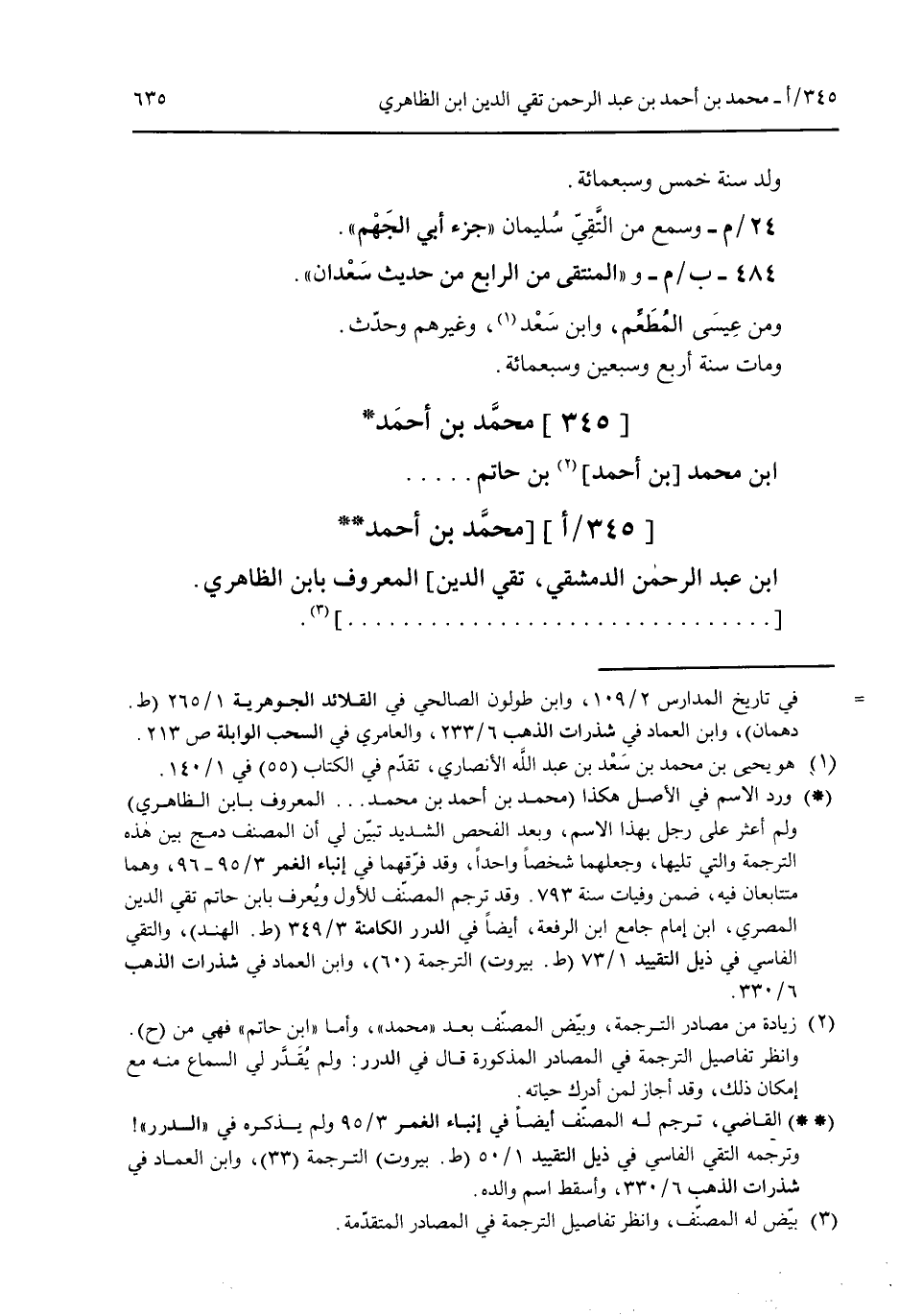 [345] محمد بن أحمد بن محمد بن أحمد بن حاتم [345/أ] محمد بن أحمد ابن عبد الرحمن الدمشقي تقي الدين المعروف بابن الظاهري