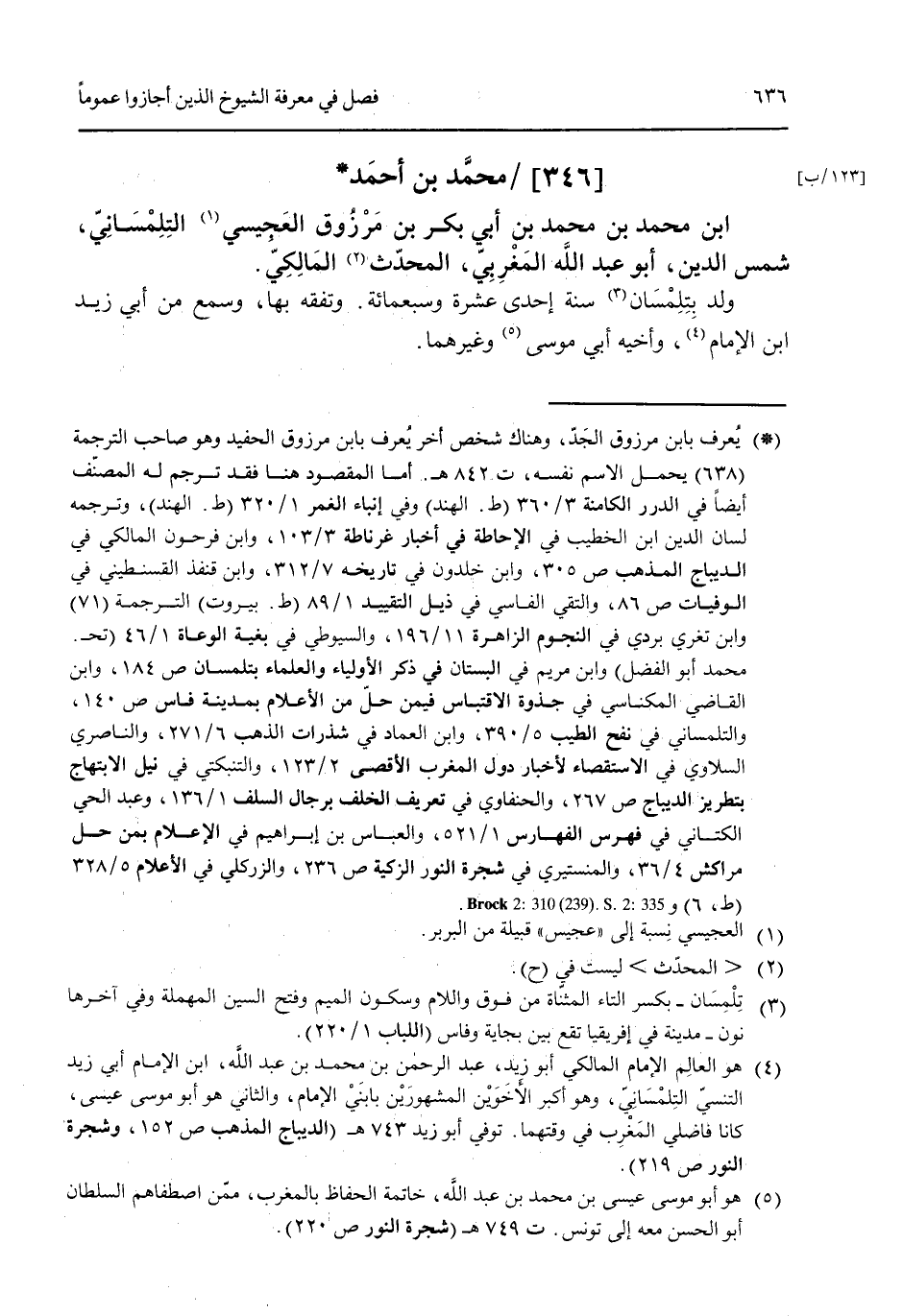 [346] محمد بن أحمد ابن محمد بن محمد بن أبي بكر بن مرزوق العجيسي التلمساتي شمس الدين أبو عبد الله المغرب المحدث المالكي ولد بتلمسان سنة إخدى عشرة وسبعمائة وتفقه بها وسمع من أبي زيد ابن الغمام وأخيه أبي موسى وغيرهما.