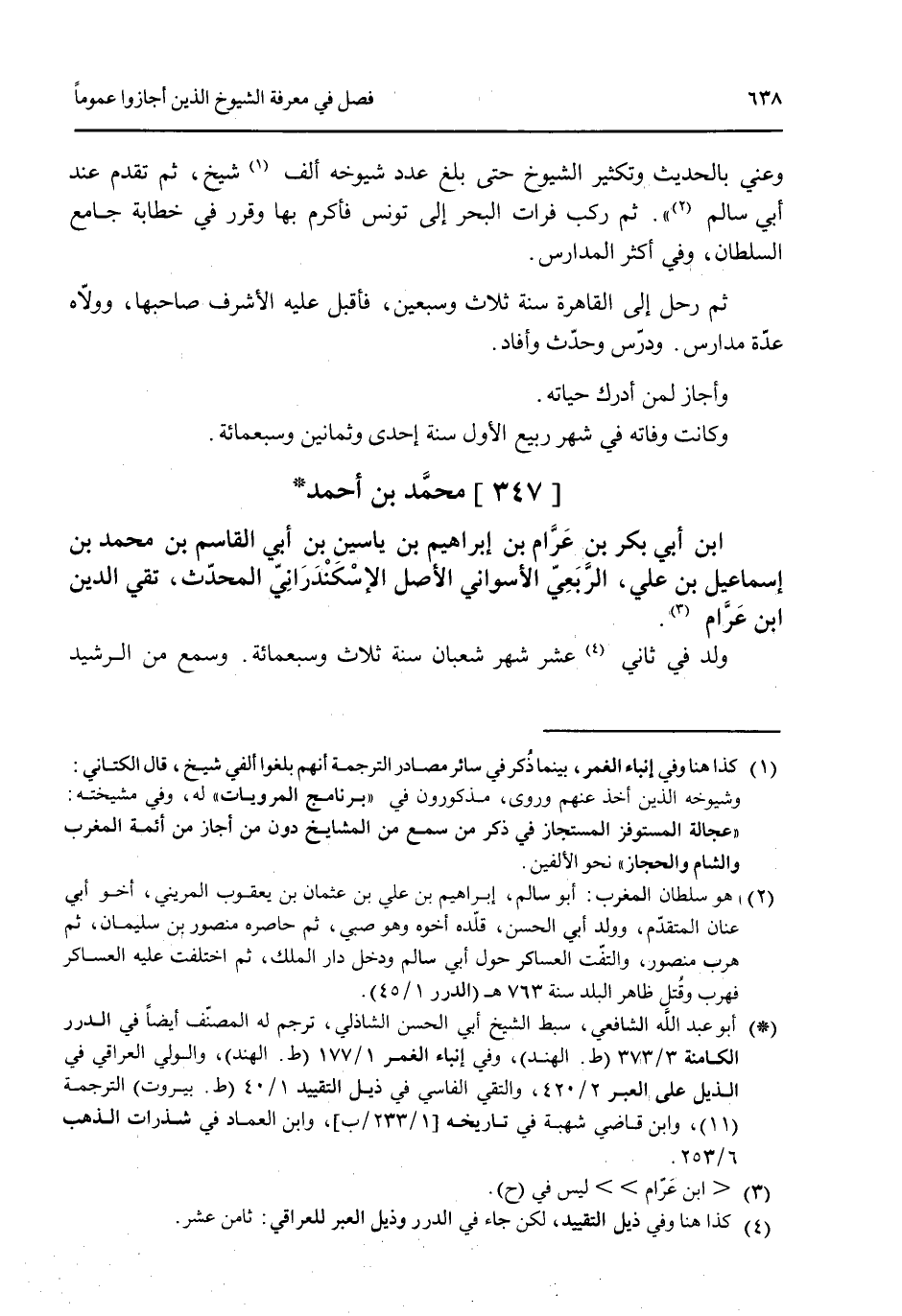 [347] محمد بن أحمد ابن أبي بكر بن عرام بن إبراهيم بن ياسين بن أبي القاسم بن محمد بن إسماعيل بن علي الربعي الأسواني الأصل الإسكندراني المحدث تقي الدين ابن عرام.