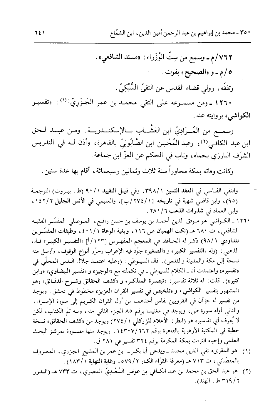 762/م- وسمع من ست الوزراء: "مسند الشافعي". 5/م- و "الصحيح" بفوت. وتفقه وولي قضاء القدس عن التقي السبكي. 1260 - ومن مسموعه على التقى محمد بن عمر الجزري: "تفسير الكواشي" بروايته عنه. وسمع من المُرادي ابن العشاب بالإسكندرية ومن عبد الحق ابن عبد الكافي وعبد المحسن ابن الصابوني بالقاهرة وأذن له فى التدريس الشرف البارزي بحماه وناب في الحكم عن العز ابن جماعة. وكانت وفاته بمكة مجاوراً سنة ثلاث وثمانين وسبعمائة أقام بها عدة سنين.