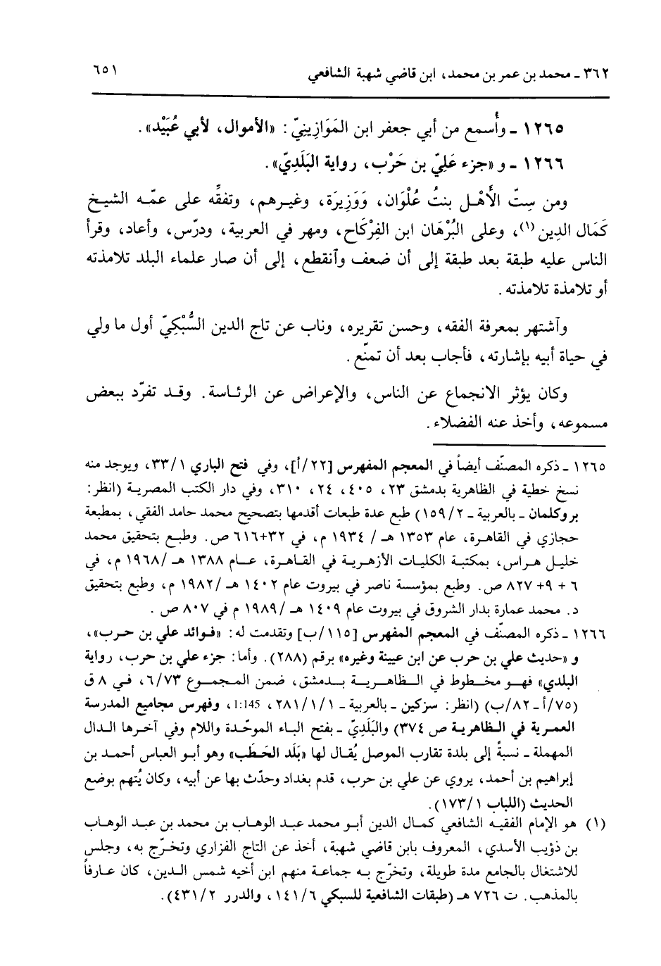 1265 - وأسمع من أبي جعفر ابن الموازيني: "الأموال لأبي عبيد". 1266 - و"جزء علي بن حرب رواية البلدي". ومن ست الأهل بنت علوان ووزيرة وغيرهم وتفقه على عمه الشيخ كمال الدين وعلى البرهان ابن الفركاح ومهر في العربية ودرس وأعاد وقرأ الناس عليه طبقة بعد طبقة إلى أن ضعف وانقطع إلى أن صار علماء البلد تلامذته أو تلامذة تلامذته. واشتهر بمعرفة الفقه وحسن تقريره وناب عن تاج الدين السبكي أول ما ولي في حياة أبيه بإشارة فأجب بعد ان تمنع. وكان يؤثر الانجماع عن الناس والإعراض عن الرئاسة. وقد تفرد ببعض مسموعه وأخذ عنه الفضلاء.