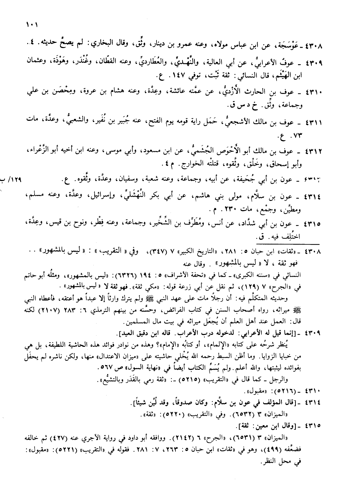 4312- عوف بن مالك أبو الأحوص الجشمي عن بن مسعود وأبي موسى وعنه بن أخيه أبوالزعراء وأبو إسحاق وخلق وثقوه قتلته الخوارج م 4