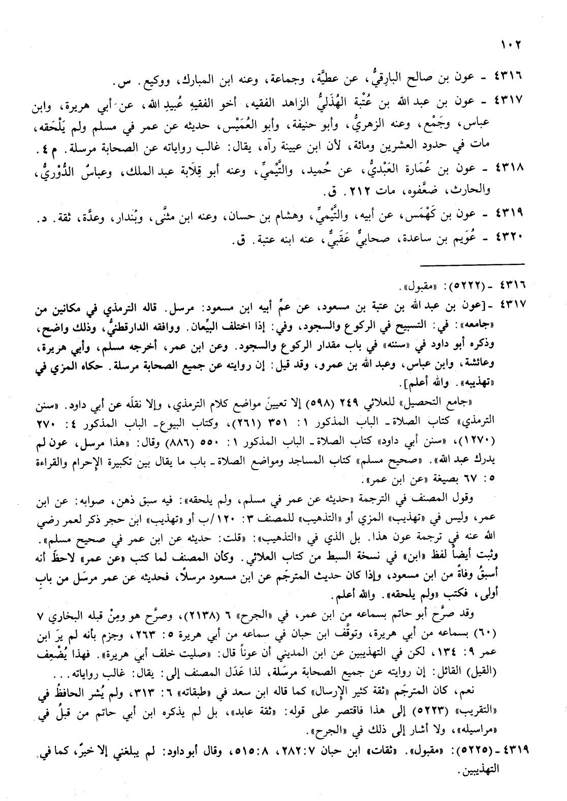 4317- عون بن عبد الله بن عتبة الهذلي الزاهد الفقيه أخو الفقيه عبيد الله عن أبي هريرة وابن عباس وجمع وعنه الزهري وأبو حنيفة وأبو العميس حديثه عن عمر في مسلم ولم يلحقه مات في حدود العشرين ومائة لان بن عيينة رآه يقال غالب رواياته عن الصحابة مرسلة م 4