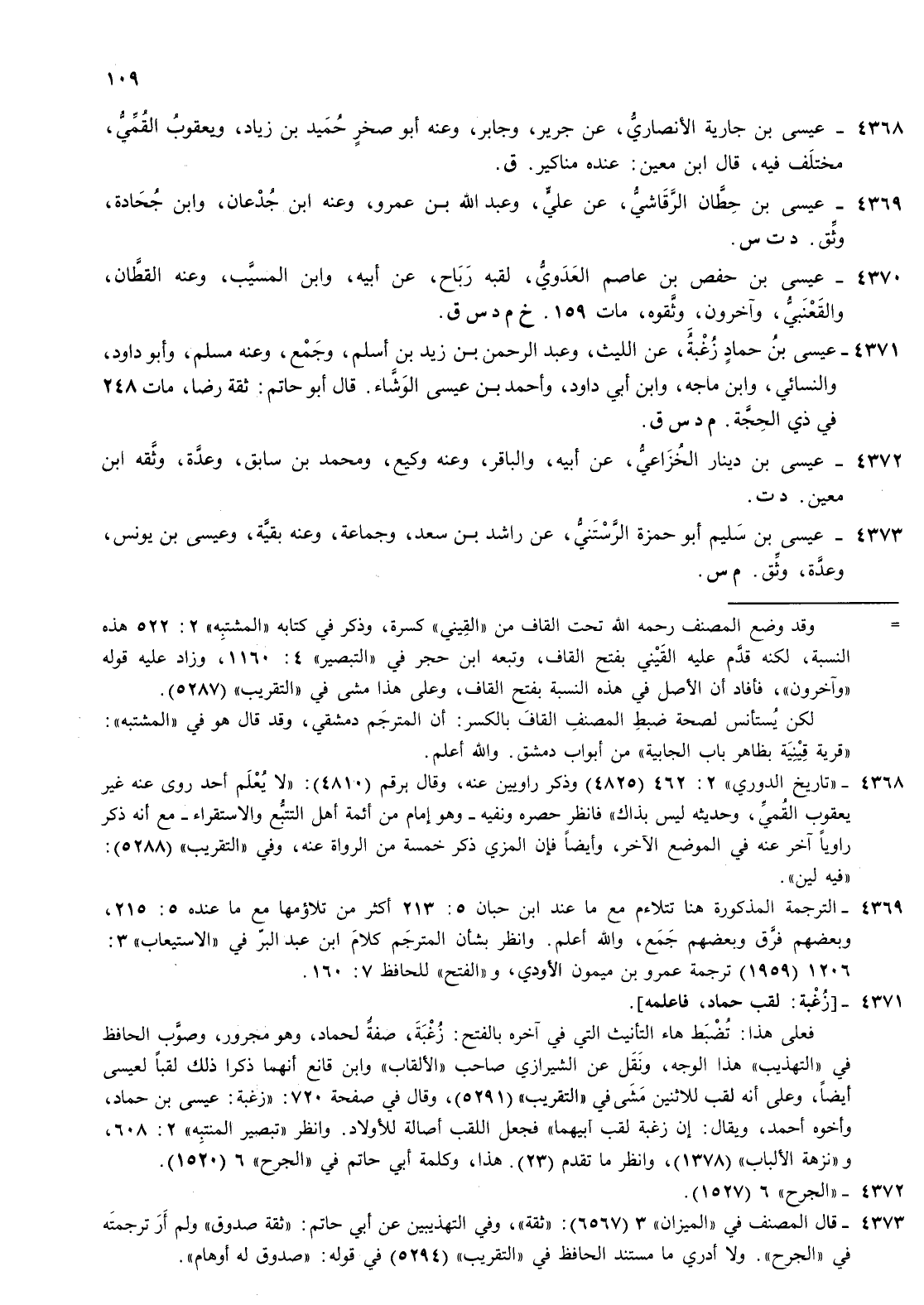 4371- عيسى بن حماد زغبة عن الليث وعبد الرحمن بن زيد بن أسلم وجمع وعنه مسلم وأبو داود والنسائي وابن ماجة وابن أبي داود وأحمد بن عيسى الوشاء قال أبو حاتم ثقة رضا مات 248 في ذي الحجة م د س ق