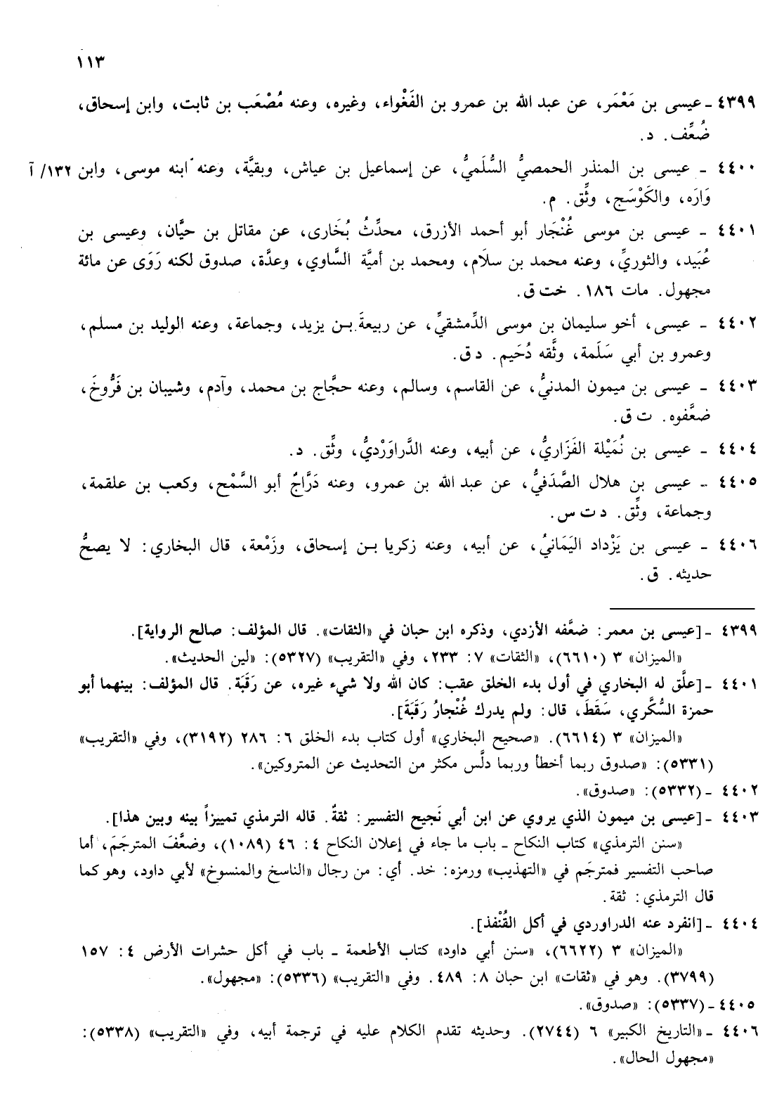 4401- عيسى بن موسى غنجار أبو أحمد الازرق محدث بخاري عن مقاتل بن حيان وعيسى بن عبيد والثوري وعنه محمد بن سلام ومحمد بن أمية الساوي وعدة صدوق لكنه روى عن مائة مجهول مات 186 خت ق