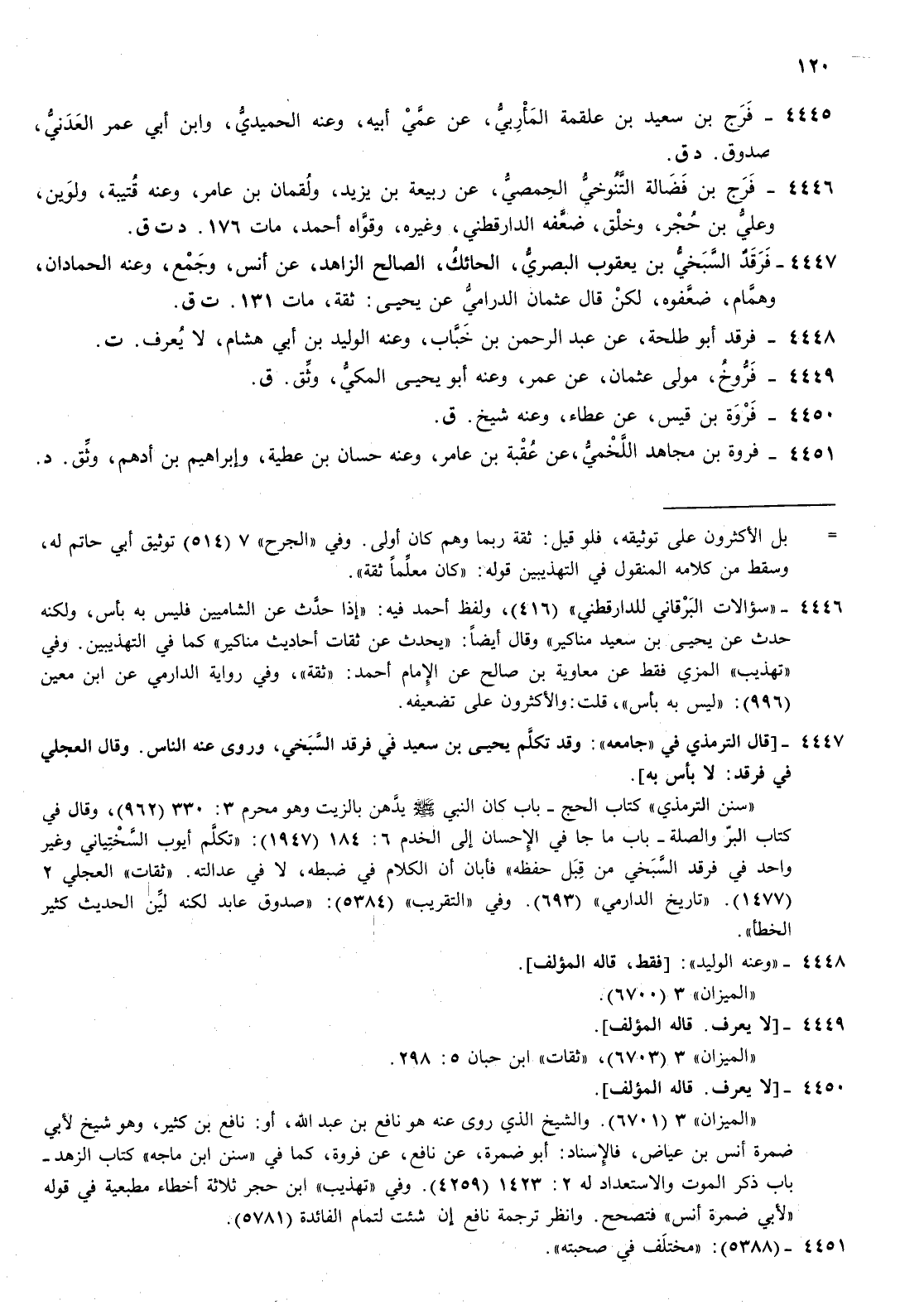4447- فرقد السبخي بن يعقوب البصري الحائك الصالح الزاهد عن أنس وجمع وعنه الحمادان وهمام ضعفوه لكن قال عثمان الدارمي عن يحيى ثقة مات 131 ت ق