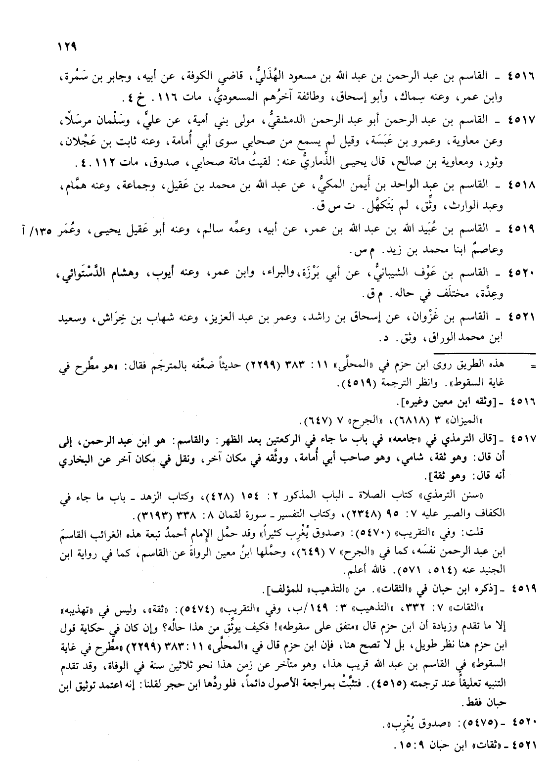 4517- القاسم بن عبد الرحمن أبو عبد الرحمن الدمشقي مولى بني أمية عن علي وسلمان مرسلا وعن معاوية وعمرو بن عبسة وقيل لم يسمع من صحابي سوى أبي أمامة وعنه ثابت بن عجلان وثور ومعاوية بن صالح قال يحيى الذماري عنه لقيت مائة صحابي صدوق مات 4 112