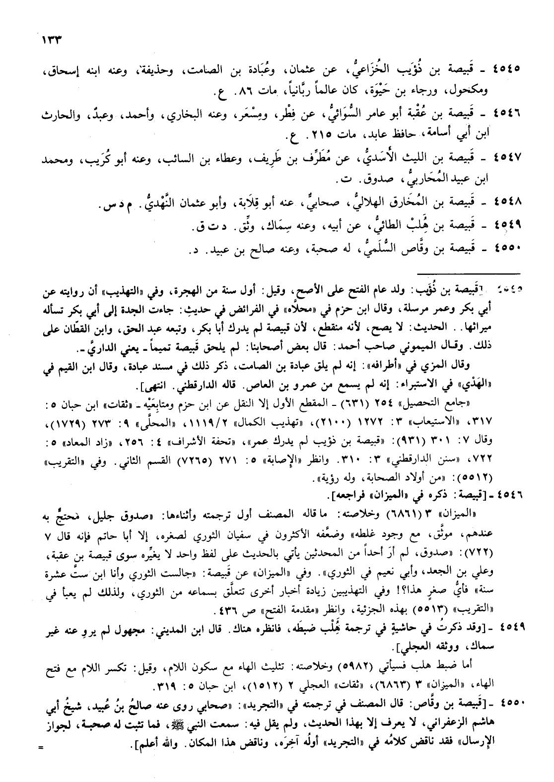 4545- قبيصة بن ذؤيب الخزاعي عن عثمان وعبادة بن الصامت وحذيفة وعنه ابنه إسحاق ومكحول ورجاء بن حيوة كان عالما ربانيا مات 86 ع