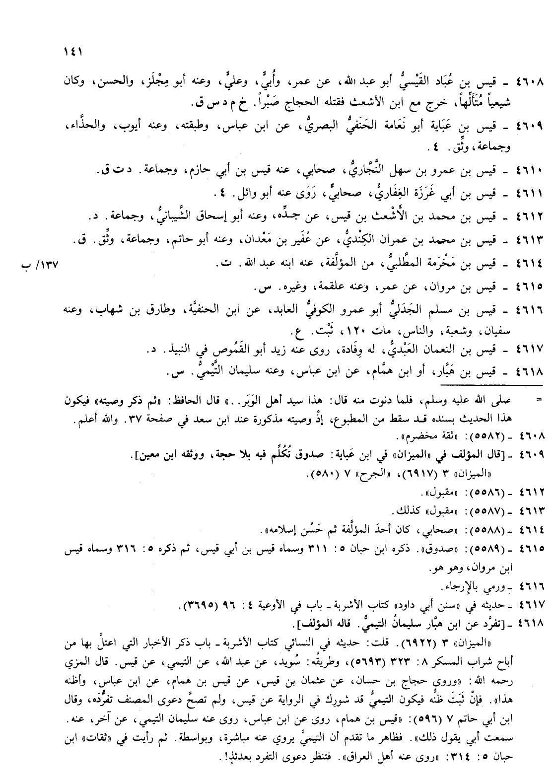 4616- قيس بن مسلم الجدلي أبو عمرو الكوفي العابد عن بن الحنفية وطارق بن شهاب وعنه سفيان وشعبة والناس مات 12 ثبت ع