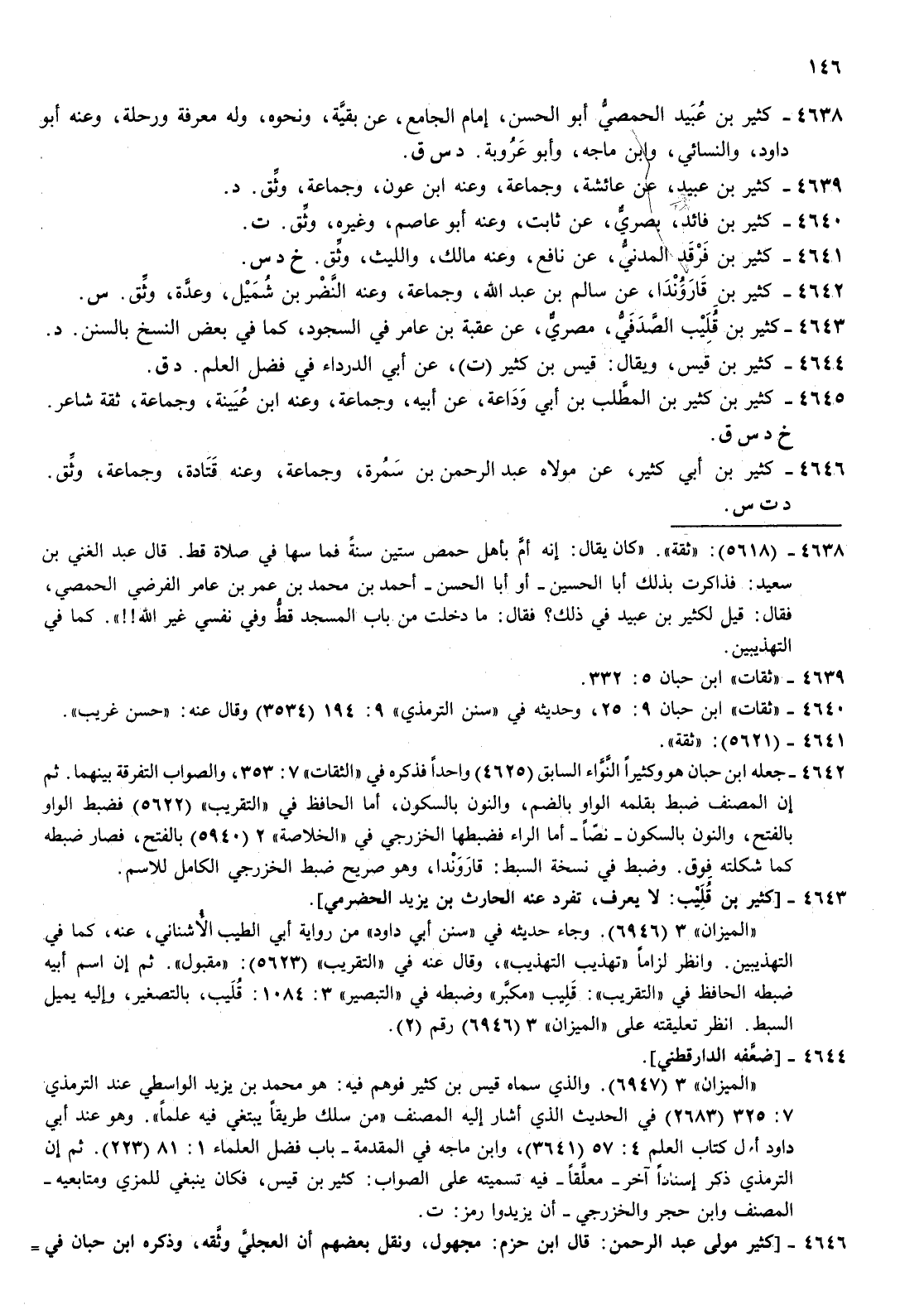 4638- كثير بن عبيد الحمصي أبو الحسن إمام الجامع عن بقية ونحوه وله معرفة ورحلة وعنه أبو داود والنسائي وابن ماجة وأبو عروبة د س ق