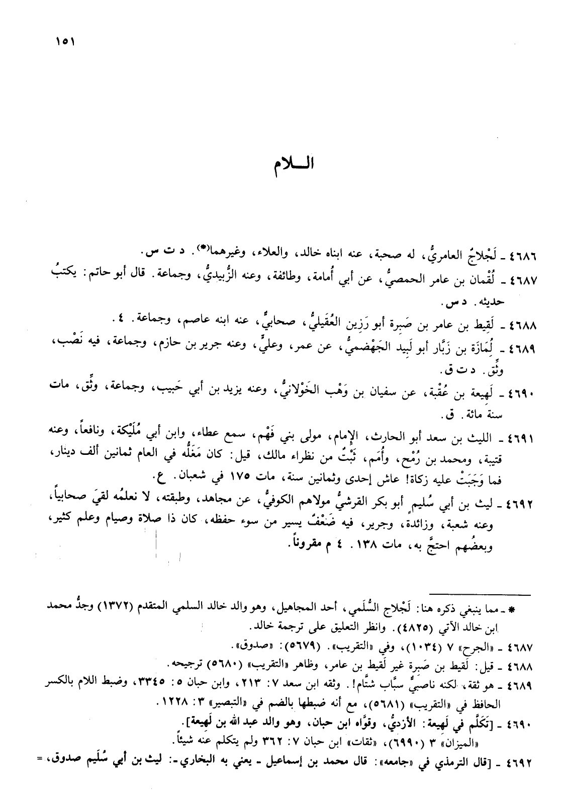 4691- الليث بن سعد أبو الحارث الامام مولى بني فهم سمع عطاء وابن أبي مليكة ونافعا وعنه قتيبة ومحمد بن رمح وأمم ثبت من نظراء مالك قيل كان مغله في العام ثمانين ألف دينار فما وجبت عليه زكاة عاش إحدى وثمانين سنة مات 175 في شعبان ع