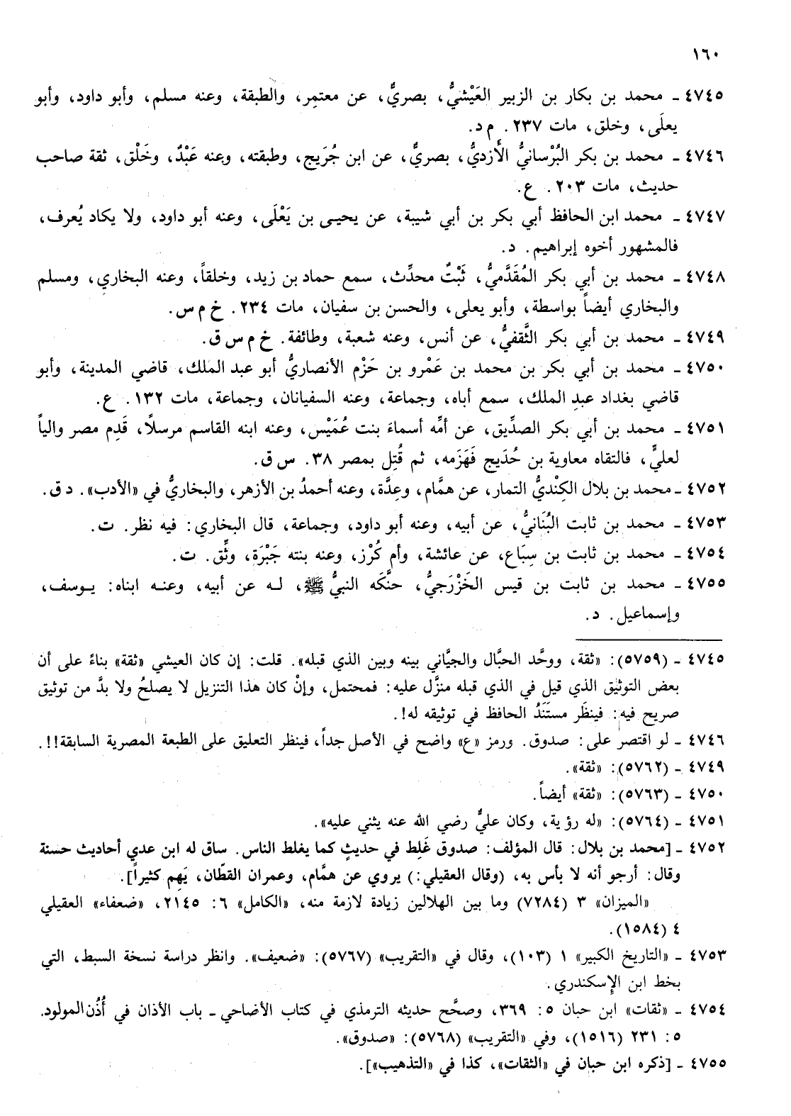 4745- محمد بن بكار بن الزبير العيشي بصري عن معتمر والطبقة وعنه مسلم وأبو داود وأبو يعلى وخلق مات 237 م د