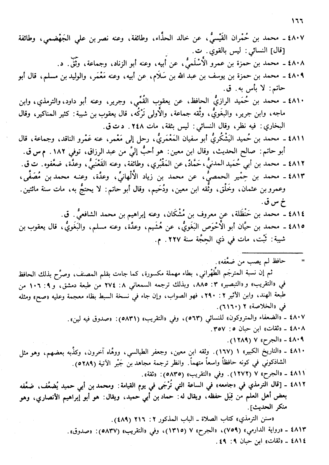 4810- محمد بن حميد الرازي الحافظ عن يعقوب القمي وجرير وعنه أبو داود والترمذي وابن ماجة وابن جرير والبغوي وثقه جماعة والاولى تركه قال يعقوب بن شيبة كثير المناكير وقال البخاري فيه نظر وقال النسائي ليس بثقة مات 248 د ت ق