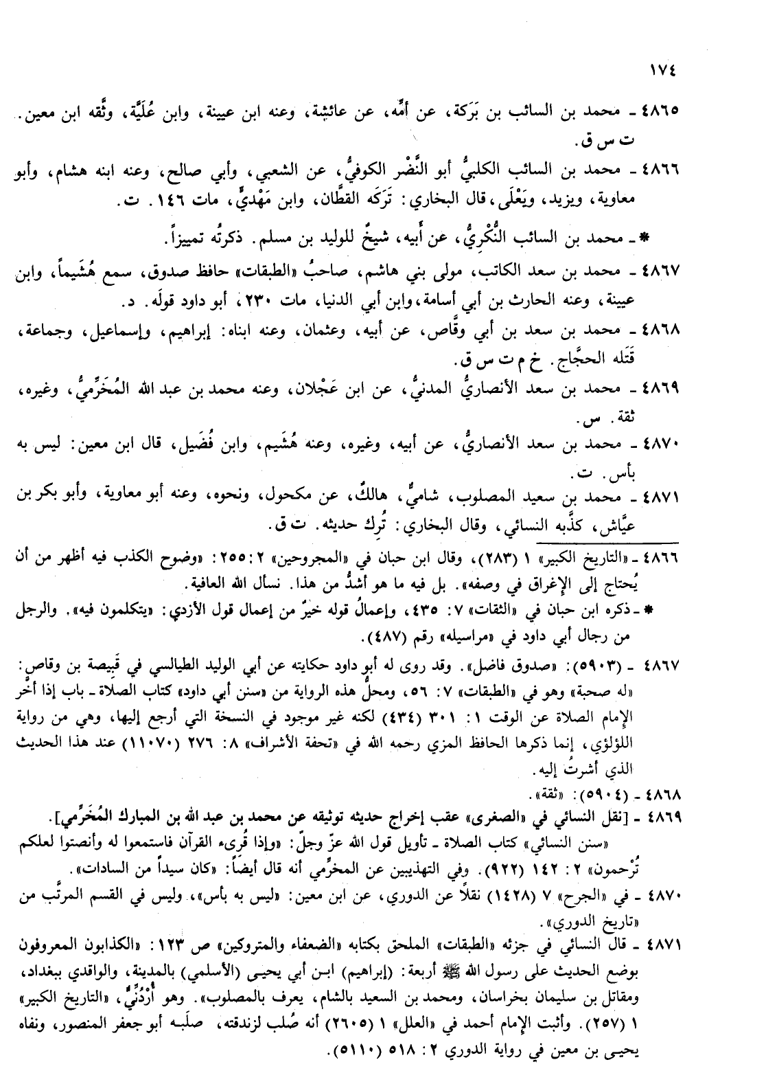 4866- محمد بن السائب الكلبي أبو النضر الكوفي عن الشعبي وأبي صالح وعنه ابنه هشام وأبو معاوية ويزيد ويعلى قال البخاري تركه القطان وابن مهدي مات 146 ت محمد بن السائب النكري عن أبيه شيخ للوليد بن مسلم ذكرته تمييزا