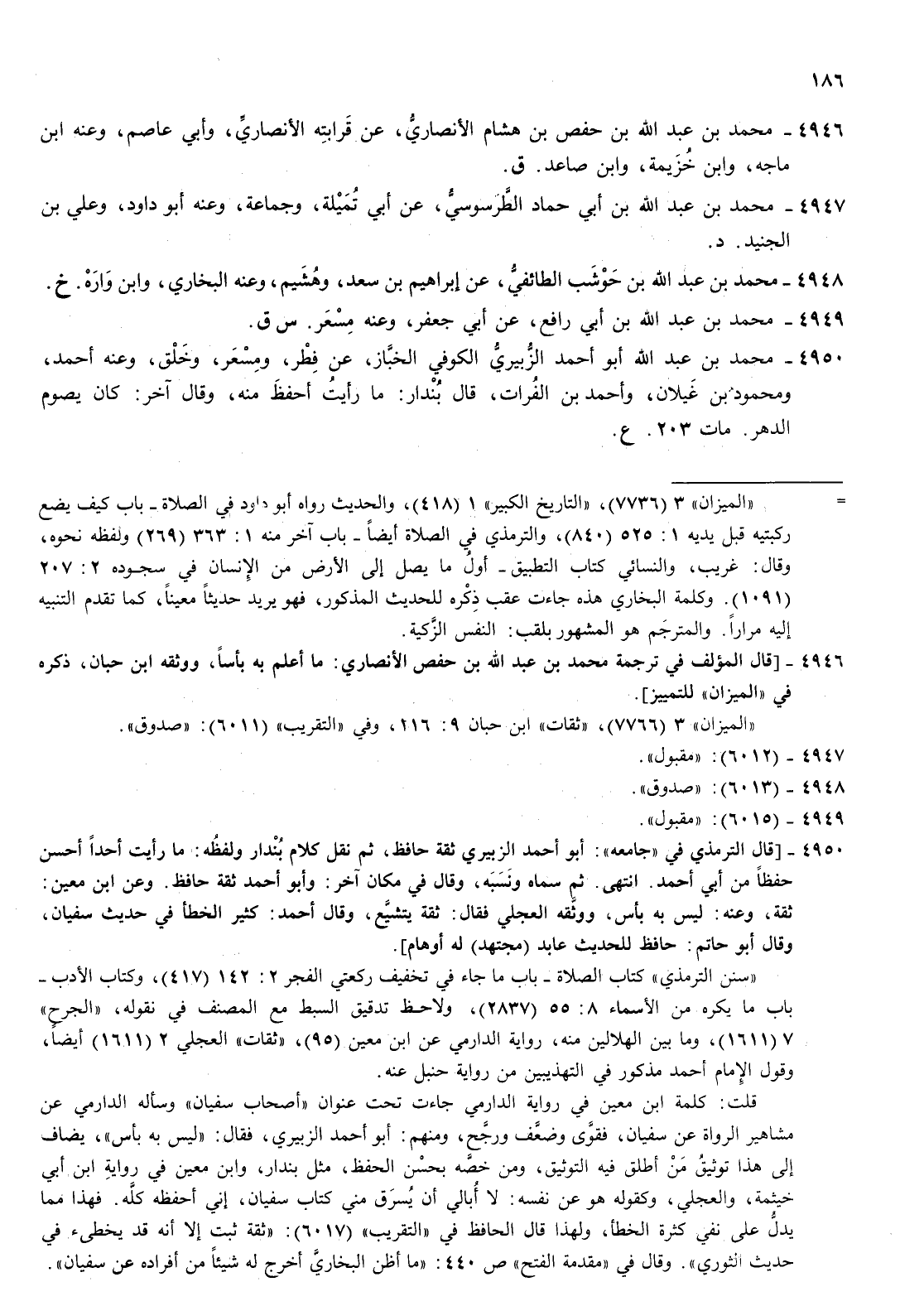 4950- محمد بن عبد الله أبو أحمد الزبيري الكوفي الخباز عن فطر ومسعر وخلق وعنه أحمد ومحمود بن غيلان وأحمد بن الفرات قال بندار ما رأيت أحفظ منه وقال آخر كان يصوم الدهر مات 203 ع