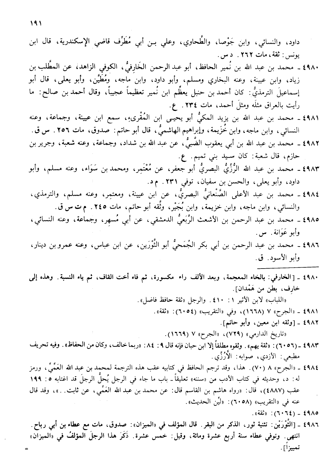 4980- محمد بن عبد الله بن نمير الحافظ أبو عبد الرحمن الخارفي الكوفي الزاهد عن المطلب بن زياد وابن عيينة وعنه البخاري ومسلم وأبو داود وابن ماجة ومطين وأبو يعلى قال أبو إسماعيل الترمذي كان أحمد بن حنبل يعظم بن نمير تعظيما عجيبا وقال أحمد بن صالح ما رأيت بالعراق مثله ومثل أحمد مات 234 ع