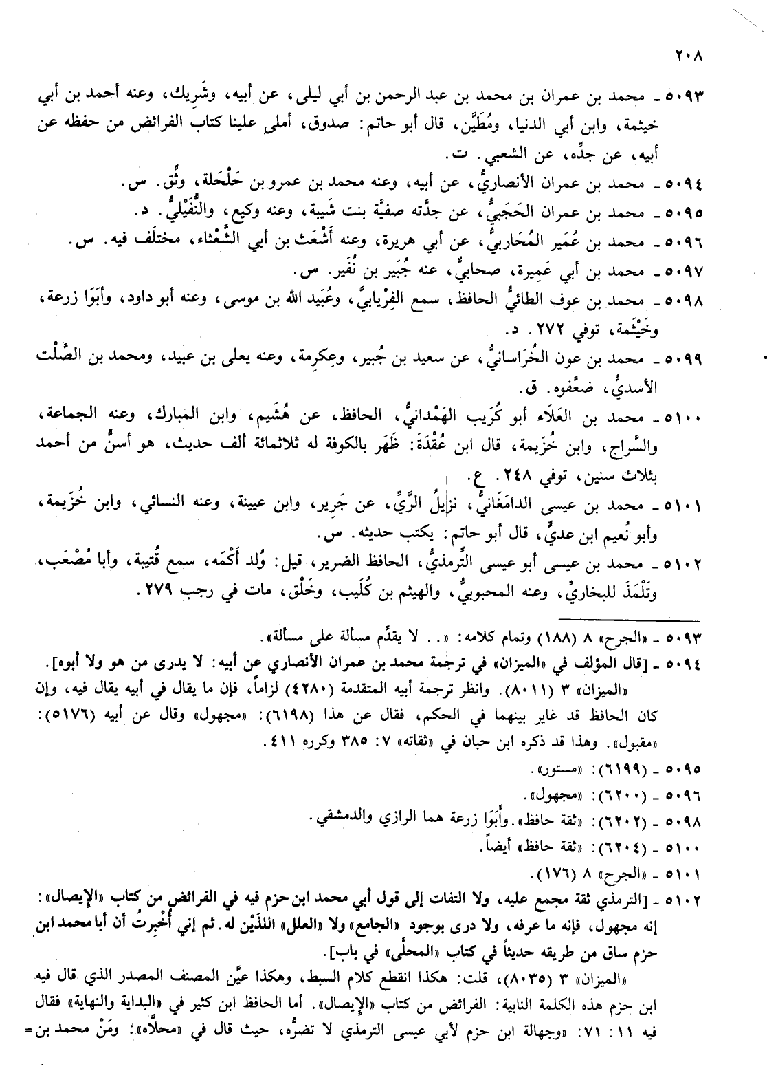 5102- محمد بن عيسى أبو عيسى الترمذي الحافظ الضرير قيل ولد أكمه سمع قتيبة وأبا مصعب وتلمذ للبخاري وعنه المحبوبي والهيثم بن كليب وخلق مات في رجب 279