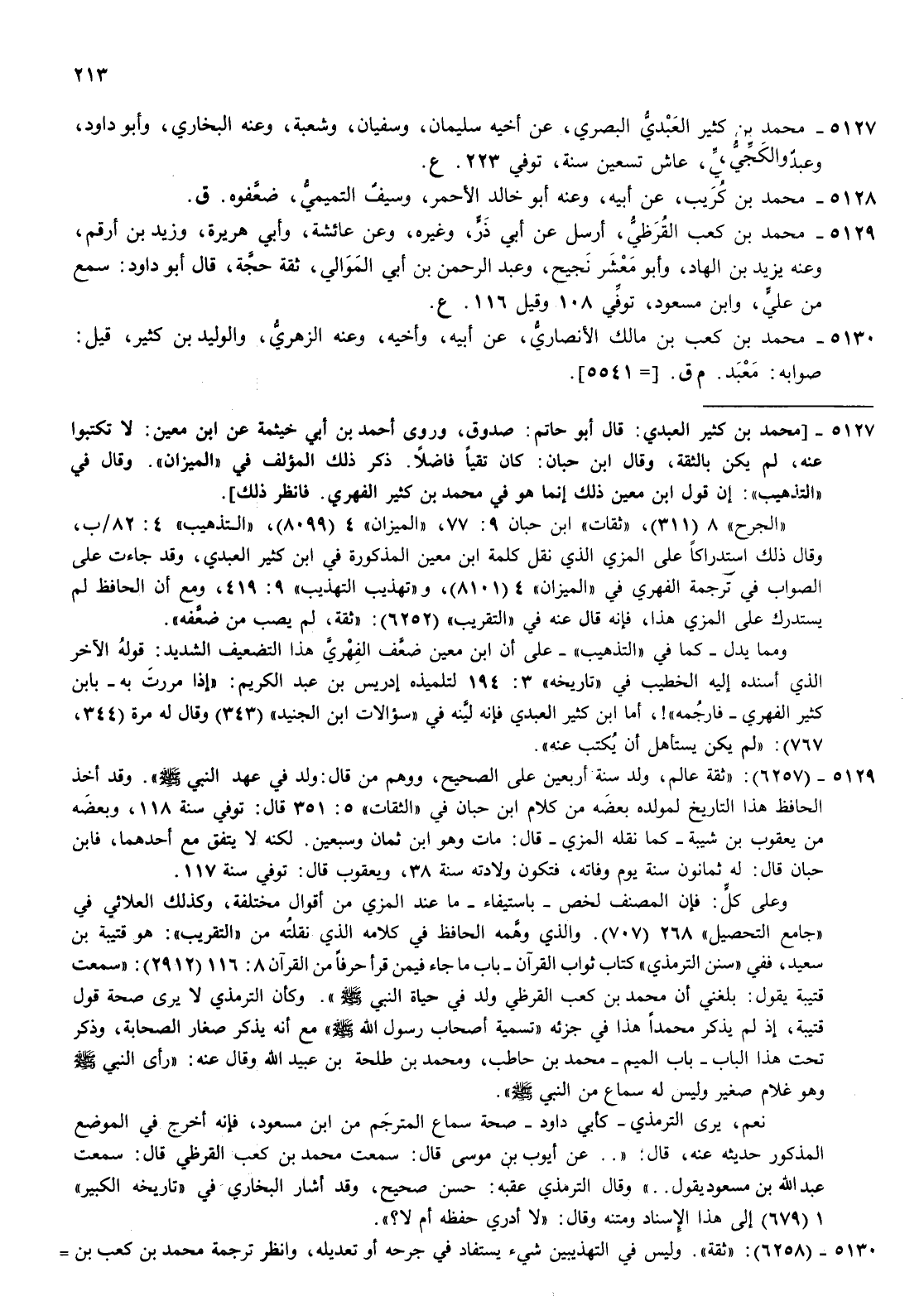 5130- محمد بن كعب بن مالك الانصاري عن أبيه وأخيه وعنه الزهري والوليد بن كثير قيل صوابه معبد م قمحمد بن كعب بن مالك الانصاري عن أبيه وأخيه وعنه الزهري والوليد بن كثير قيل صوابه معبد م ق 5541