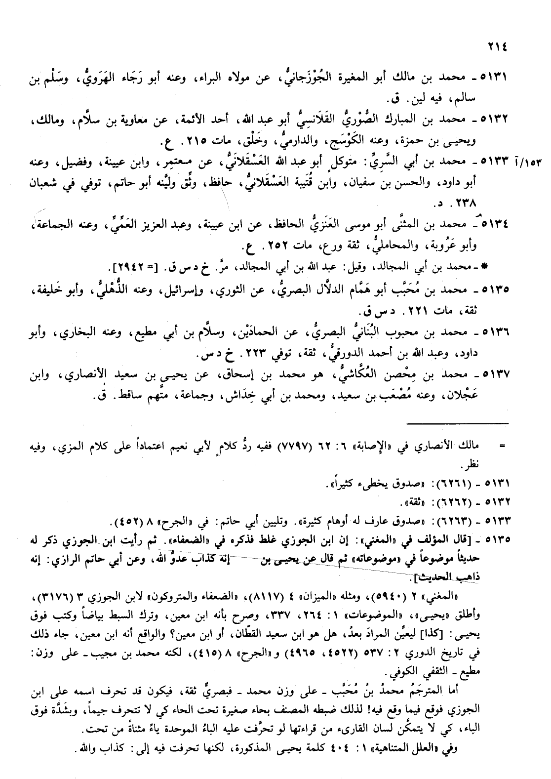 5134- محمد بن المثنى أبو موسى العنزي الحافظ عن بن عيينة وعبد العزيز العمي وعنه الجماعة وأبو عروبة والمحاملي ثقة ورع مات 252 ع محمد بن أبي المجالد وقيل عبد الله بن أبي المجالد مر خ د س قمحمد بن أبي المجالد وقيل عبد الله بن أبي المجالد مر خ د س ق 2942
