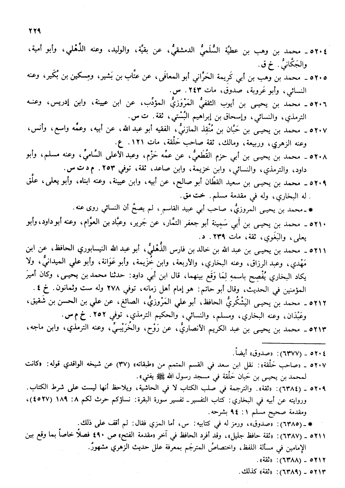 5211- محمد بن يحيى بن عبد الله بن خالد بن فارس الذهلي أبو عبد الله النيسابوري الحافظ عن بن مهدي وعبد الرزاق وعنه البخاري والاربعة وابن خزيمة وأبو عوانة وأبو علي الميداني ولا يكاد البخاري يفصح باسمه لما وقع بينهما قال بن أبي داود حدثنا محمد بن يحيى وكان أمير المؤمنين في الحديث وقال أبو حاتم هو إمام أهل زمانه توفي 278 وله ست وثمانون خ 4
