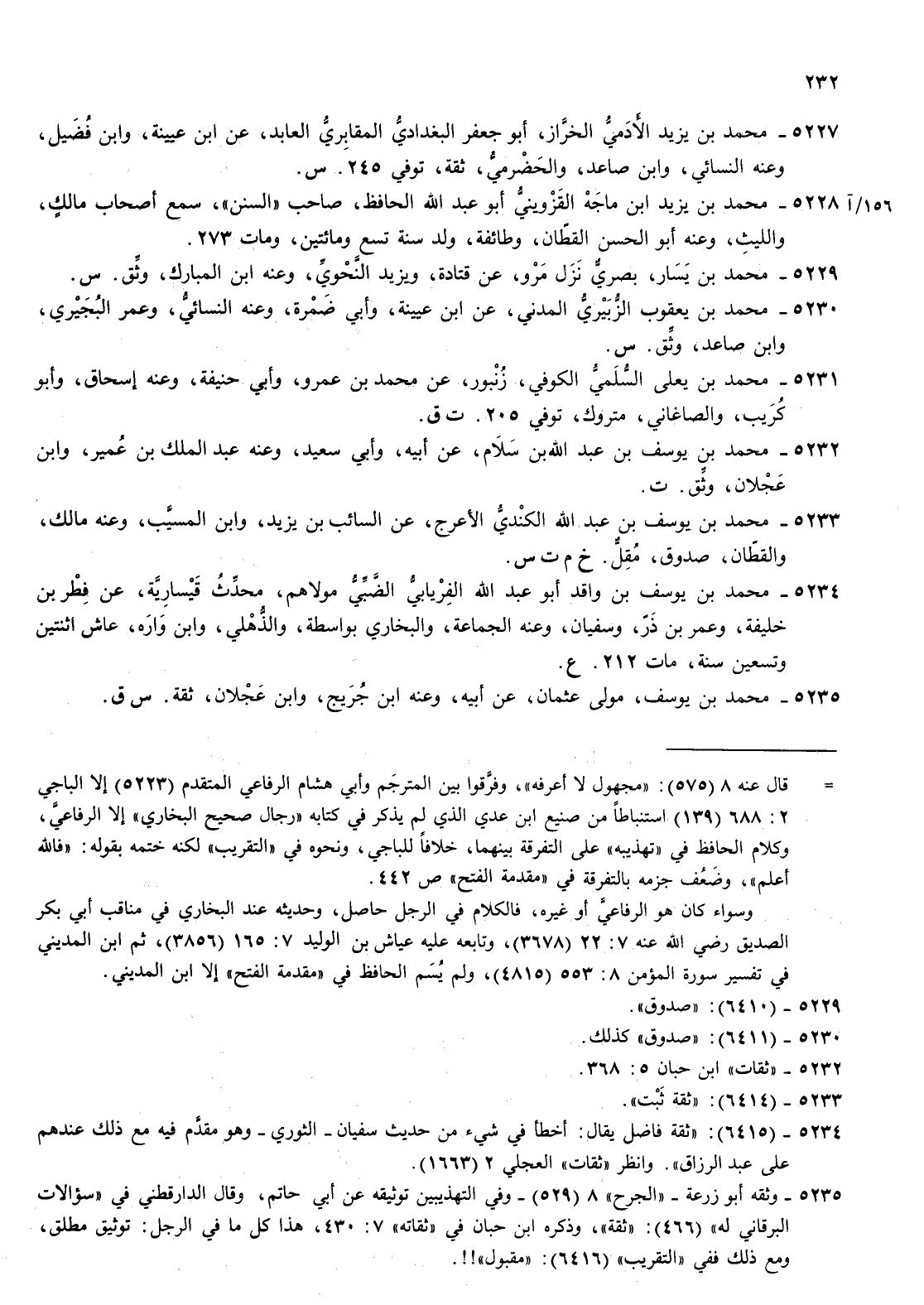 5227- محمد بن يزيد الادمي الخراز أبو جعفر البغدادي المقابري العابد عن بن عيينة وابن فضيل وعنه النسائي وابن صاعد والحضرمي ثقة توفي 245 س