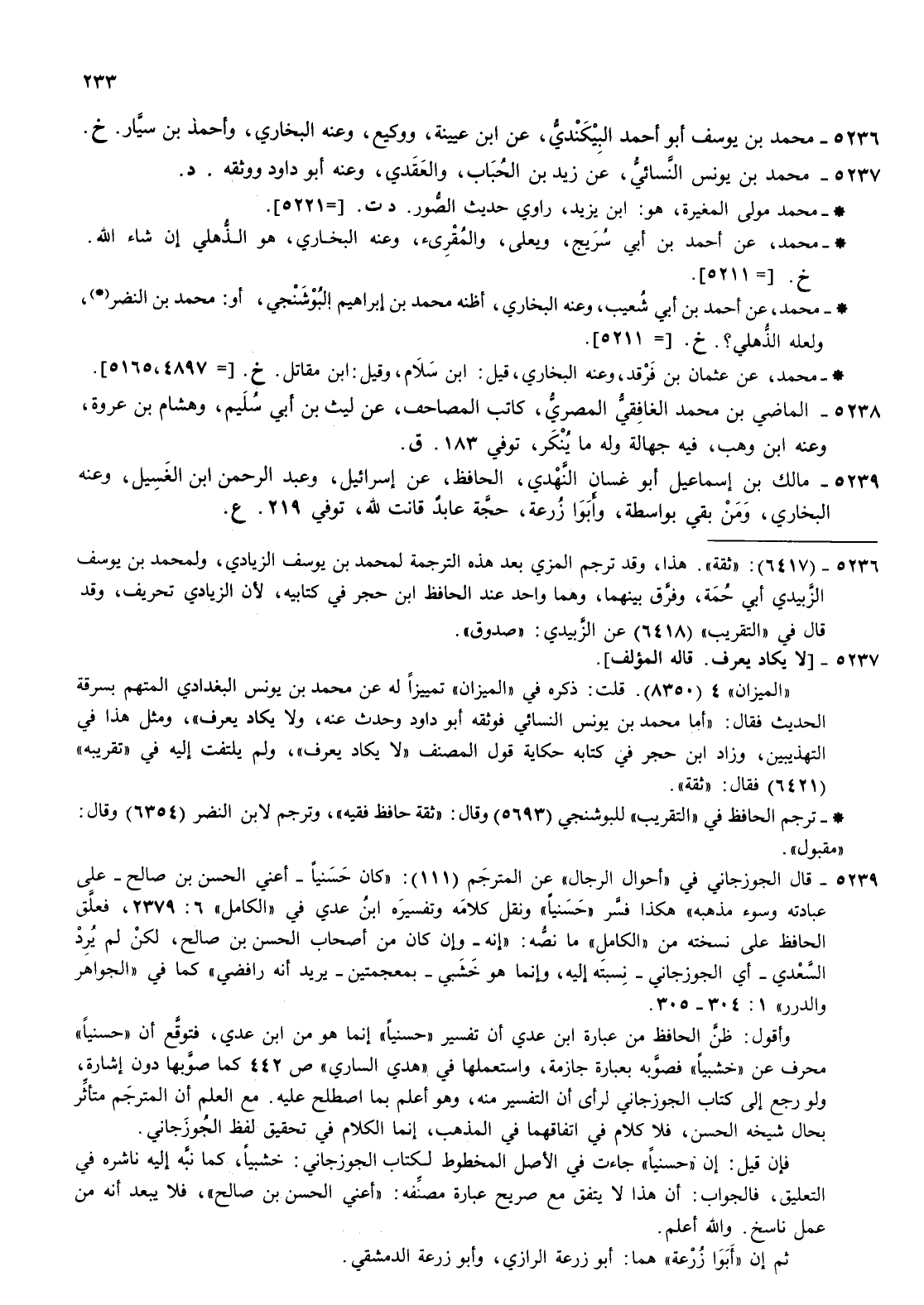 5237- الله عز وجل محمد بن يونس النسائي عن زيد بن الحباب والعقدي وعنه أبو داود ووثقه د محمد مولى المغيرة هو بن يزيد راوي حديث الصور د تمحمد مولى المغيرة هو بن يزيد راوي حديث الصور د ت 5221 محمد عن أحمد بن أبي سريج ويعلى والمقرئ وعنه البخاري هو الذهلي إن شاء الله خمحمد عن أحمد بن أبي سريج ويعلى والمقرئ وعنه البخاري هو الذهلي إن شاء الله خ 5211 محمد عن أحمد بن أبي شعيب وعنه البخاري أظنه محمد بن إبراهيم البوشنجي أو محمد بن النضر ولعله الذهلي خمحمد عن أحمد بن أبي شعيب وعنه البخاري أظنه محمد بن إبراهيم البوشنجي أو محمد بن النضر ولعله الذهلي خ 5211 محمد عن عثمان بن فرقد وعنه البخاري قيل بن سلام وقيل بن مقاتل خمحمد عن عثمان بن فرقد وعنه البخاري قيل بن سلام وقيل بن مقاتل خ 4897 5165
