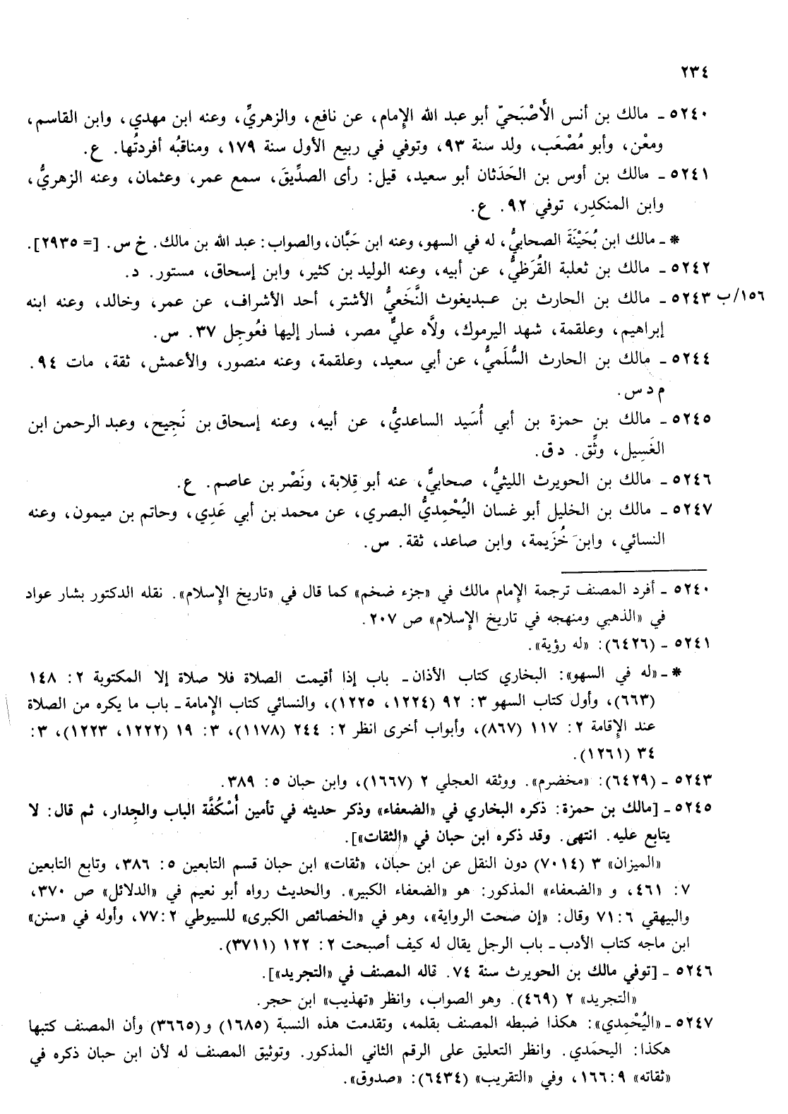 5240- مالك بن أنس الاصبحي أبو عبد الله الامام عن نافع والزهري وعنه بن مهدي وابن القاسم ومعن وأبو مصعب ولد سنة 93 وتوفي في ربيع الاول سنة 179 ومناقبه أفردتها ع