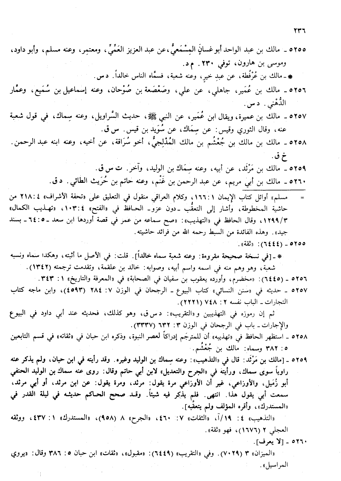 5255- مالك بن عبد الواحد أبو غسان المسمعي عن عبد العزيز العمي ومعتمر وعنه مسلم وأبو داود وموسى بن هارون توفي 23 م د مالك بن عرفطة عن عبد خير وعنه شعبة فسماه الناس خالدا د س