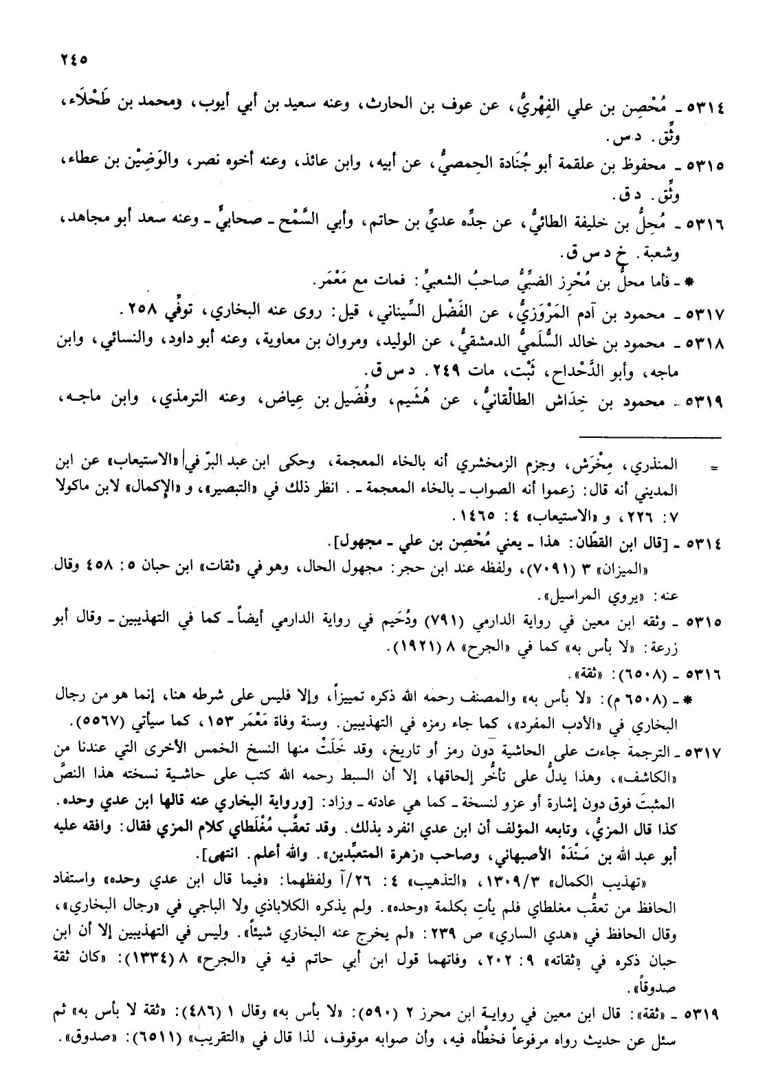 5316- محل بن خليفة الطائي عن جده عدي بن حاتم وأبي السمح صحابي وعنه سعد أبو مجاهد وشعبة خ د س ق فأما محل بن محرز الضبي صاحب الشعبي فمات مع معمر