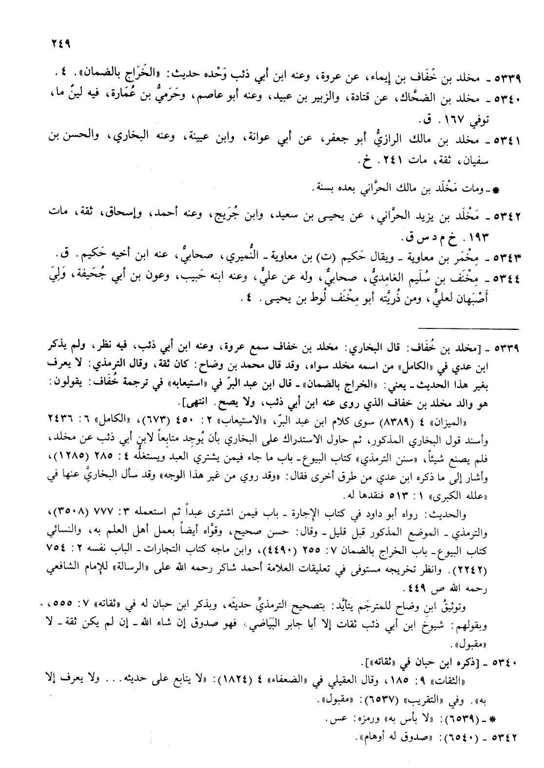 5339- مخلد بن خفاف بن إيماء عن عروة وعنه بن أبي ذئب وحده حديث الخراج بالضمان 4