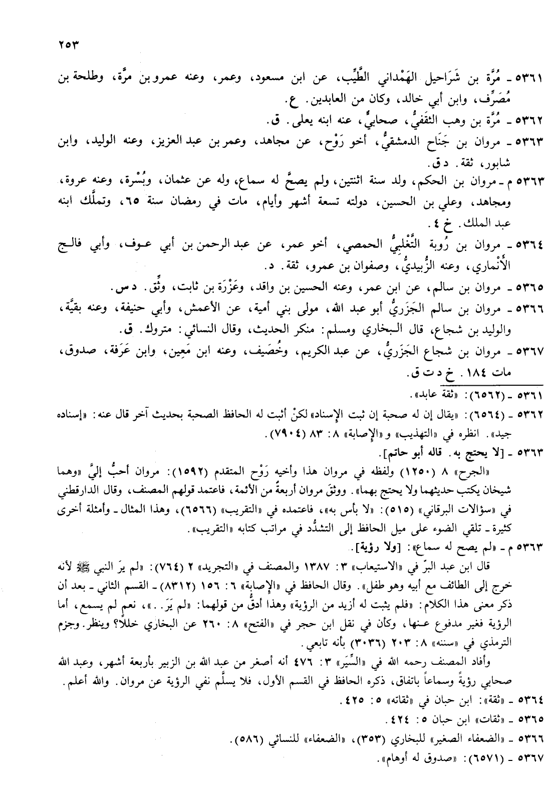 5364- مروان بن روبة التغلبي الحمصي أخو عمر عن عبد الرحمن بن أبي عوف وأبي فالج الانماري وعنه الزبيدي وصفوان بن عمرو ثقة د