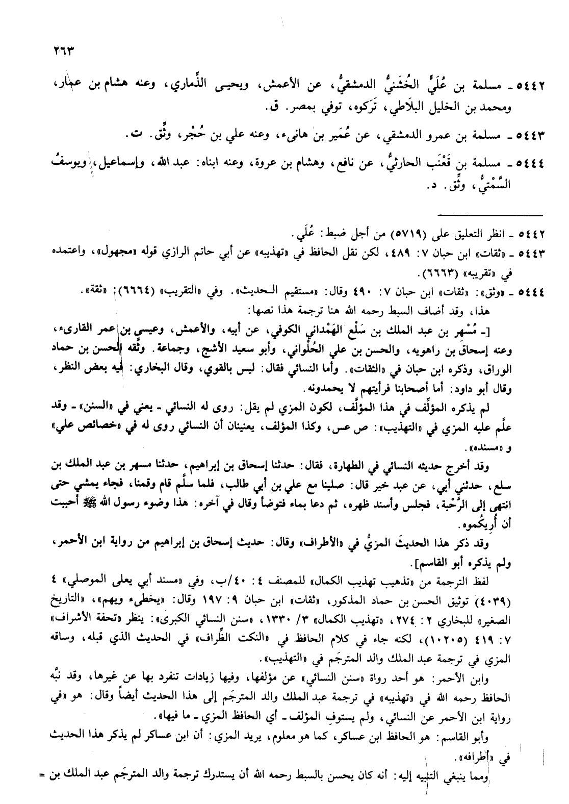 5442- مسلمة بن علي الخشني الدمشقي عن الاعمش ويحيى الذماري وعنه هشام بن عمار ومحمد بن الخليل البلاطي تركوه توفي بمصر ق
