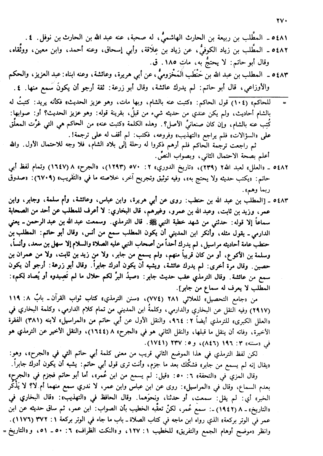 5483- المطلب بن عبد الله بن حنطب المخزومي عن أبي هريرة وعائشة وعنه ابناه عبد العزيز والحكم والاوزاعي قال أبو حاتم لم يدرك عائشة وقال أبو زرعة ثقة أرجو أن يكون سمع منها 4