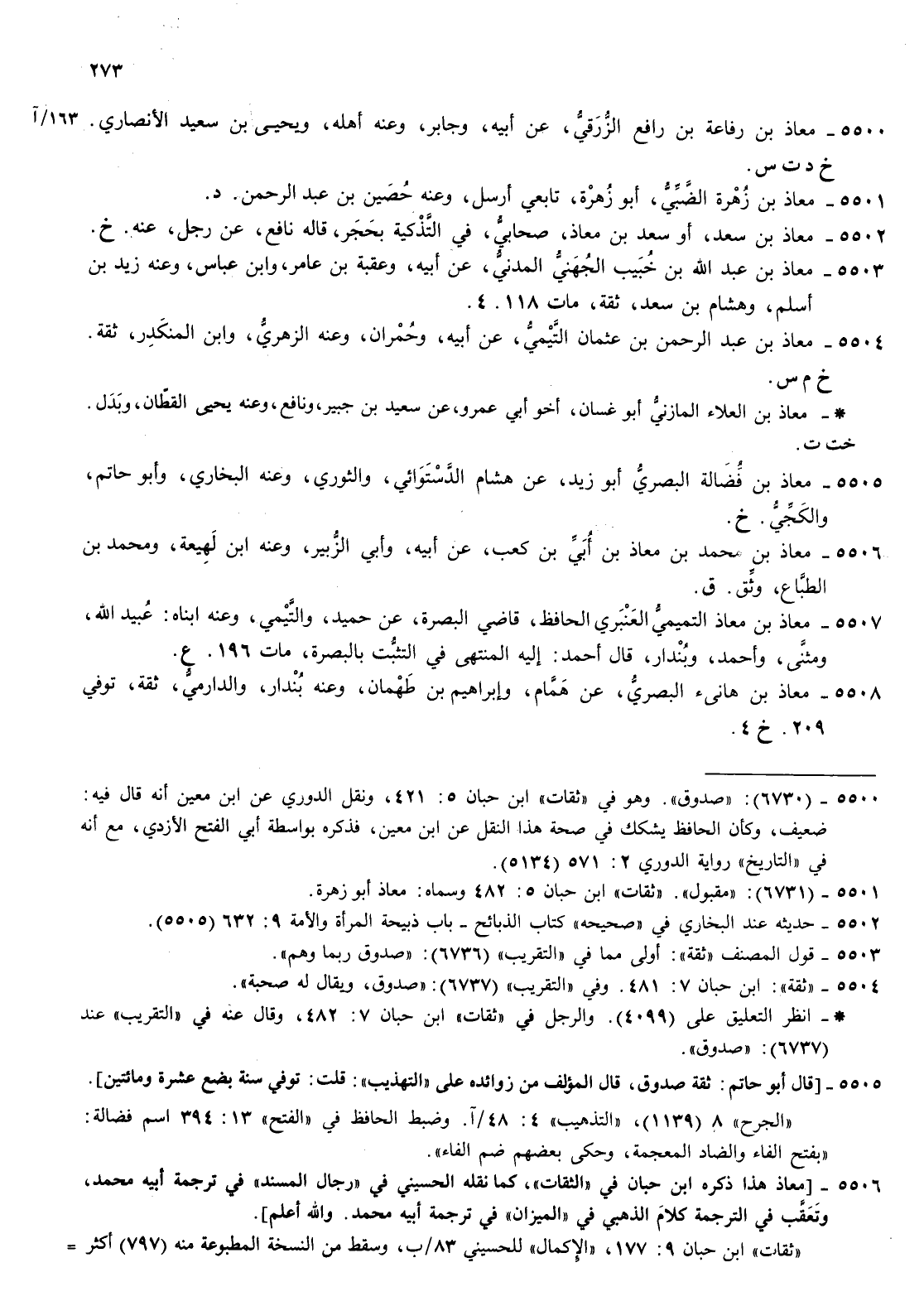 5507- معاذ بن معاذ التميمي العنبري الحافظ قاضي البصرة عن حميد والتيمي وعنه ابناه عبيد الله ومثنى وأحمد وبندار قال أحمد إليه المنتهى في التثبت بالبصرة مات 196 ع