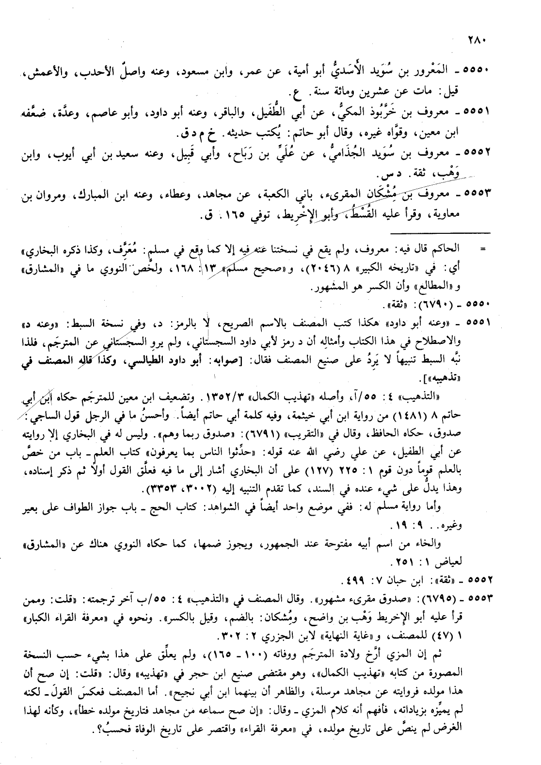 5551- معروف بن خربوذ المكي عن أبي الطفيل والباقر وعنه أبو داود وأبو عاصم وعدة ضعفه بن معين وقواه غيره وقال أبو حاتم يكتب حديثه خ م د ق