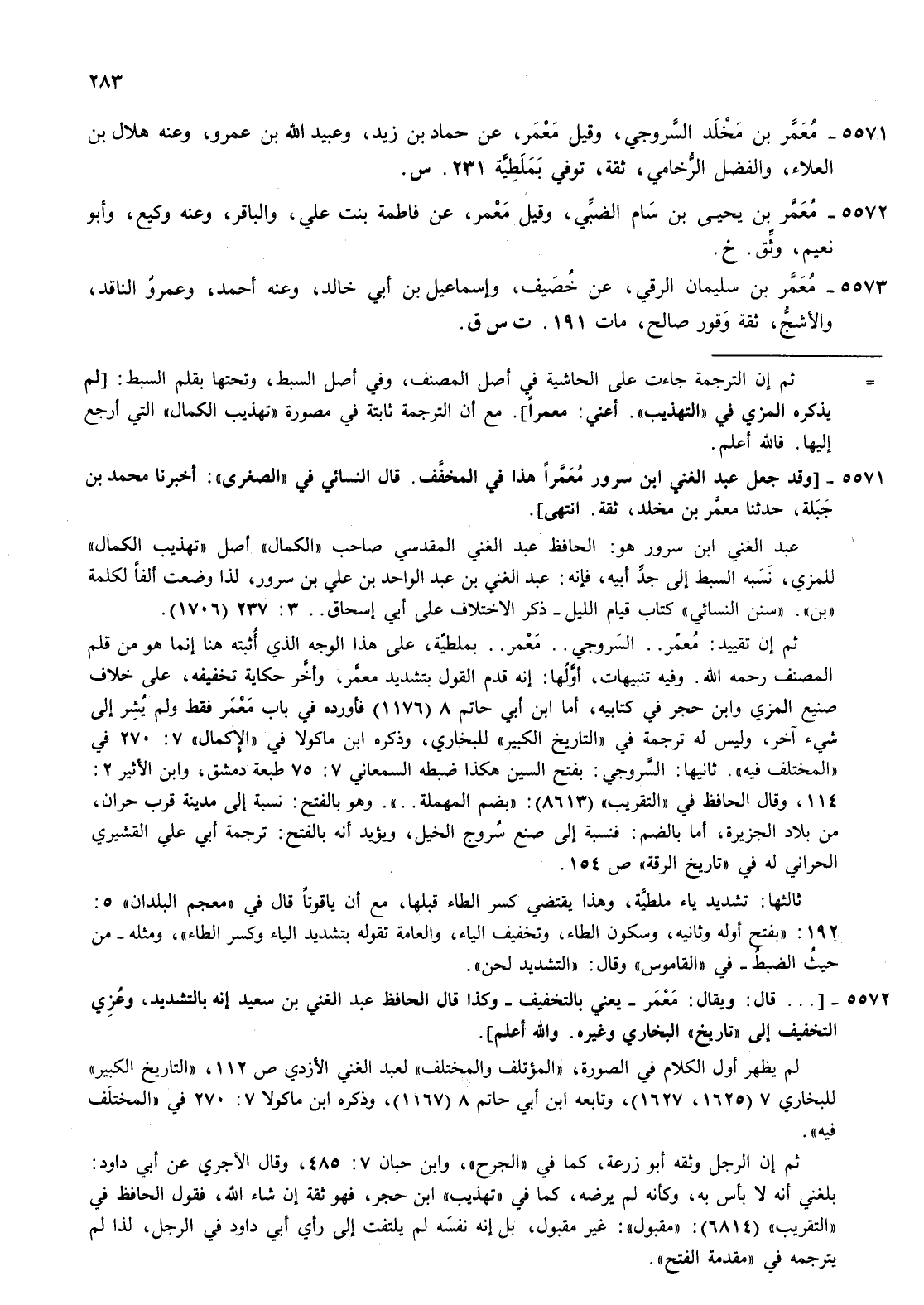 5571- معمر بن مخلد السروجي وقيل معمر عن حماد بن زيد وعبيد الله بن عمرو وعنه هلال بن العلاء والفضل الرخامي ثقة توفي بملطية 231 س