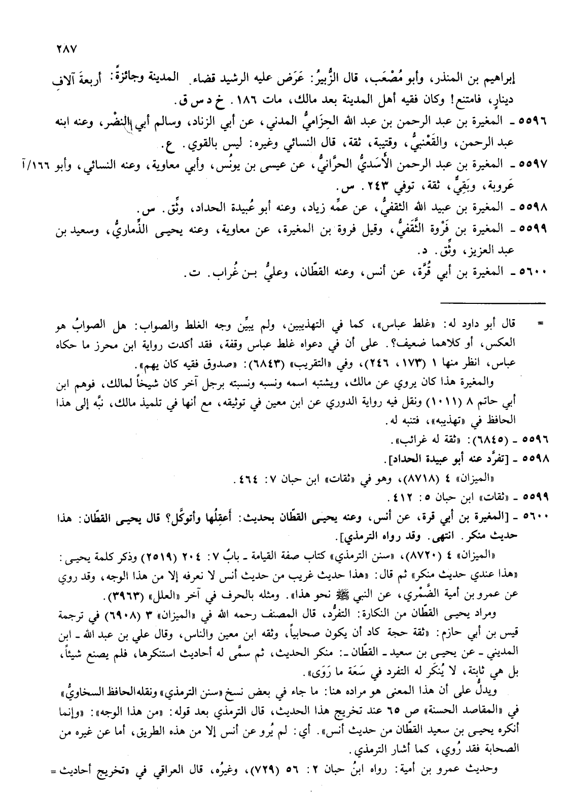 5597- المغيرة بن عبد الرحمن الاسدي الحراني عن عيسى بن يونس وأبي معاوية وعنه النسائي وأبو عروبة وبقي ثقة توفي 243 س