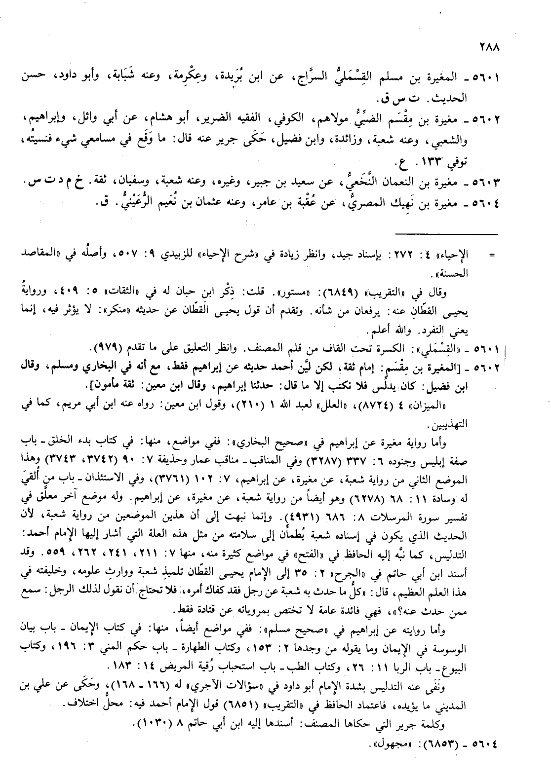 5602- مغيرة بن مقسم الضبي مولاهم الكوفي الفقيه الضرير أبو هشام عن أبي وائل وإبراهيم والشعبي وعنه شعبة وزائدة وابن فضيل حكى جرير عنه قال ما وقع في مسامعي شئ فنسيته توفي 133 ع