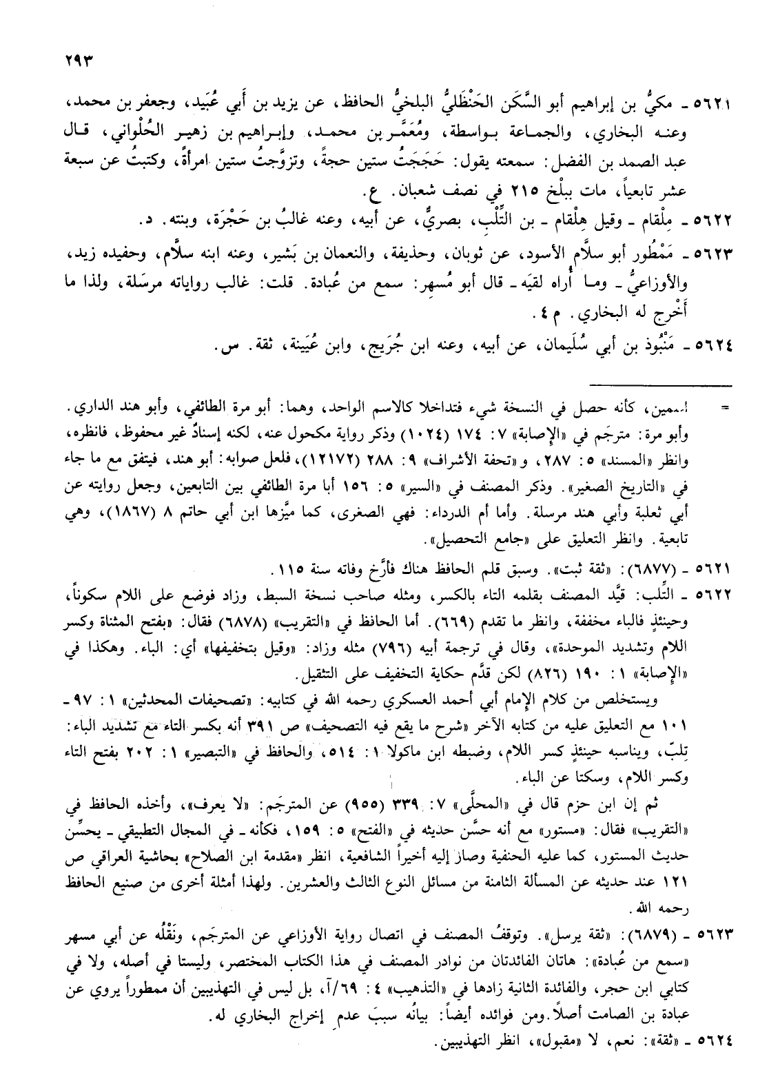 5621- مكي بن إبراهيم أبو السكن الحنظلي البلخي الحافظ عن يزيد بن أبي عبيد وجعفر بن محمد وعنه البخاري والجماعة بواسطة ومعمر بن محمد وإبراهيم بن زهير الحلواني قال عبد الصمد بن الفضل سمعته يقول حججت ستين حجة وتزوجت ستين امرأة وكتبت عن سبعة عشر تابعيا مات ببلخ 215 في نصف شعبان ع