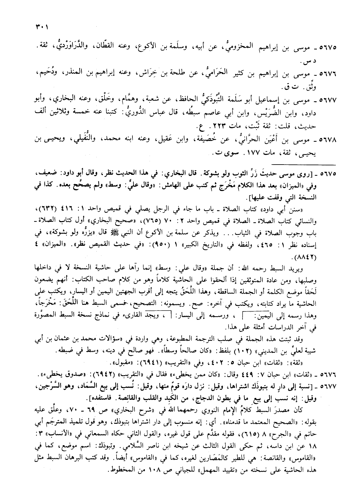 5677- موسى بن إسماعيل أبو سلمة التبوذكي الحافظ عن شعبة وهمام وخلق وعنه البخاري وأبو داود وابن الضريس وابن أبي عاصم سبطه قال عباس الدوري كتبنا عنه خمسة وثلاثين ألف حديث قلت ثقة ثبت مات 223 ع