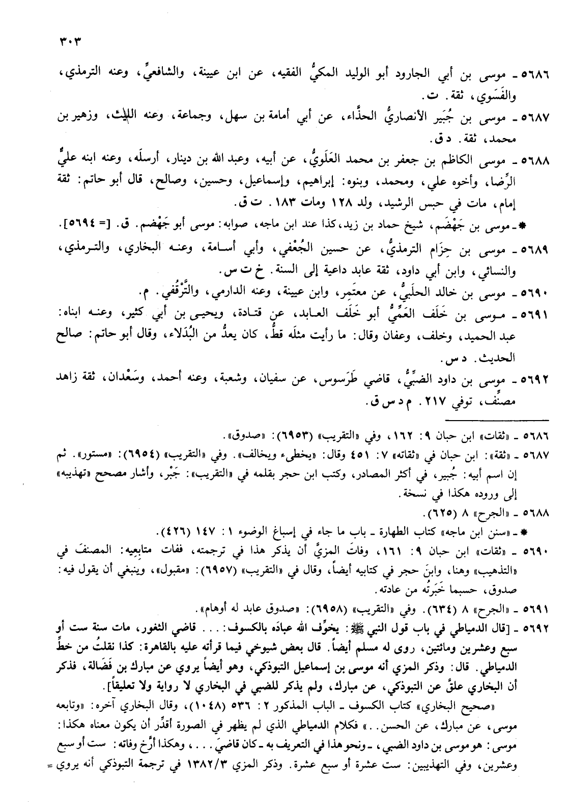 5688- موسى الكاظم بن جعفر بن محمد العلوي عن أبيه وعبد الله بن دينار أرسله وعنه ابنه علي الرضا وأخوه علي ومحمد وبنوه إبراهيم وإسماعيل وحسين وصالح قال أبو حاتم ثقة إمام مات في حبس الرشيد ولد 128 ومات 183 ت ق موسى بن جهضم شيخ حماد بن زيد كذا عند بن ماجة صوابه موسى أبوجهضم قموسى بن جهضم شيخ حماد بن زيد كذا عند بن ماجة صوابه موسى أبوجهضم ق 5694
