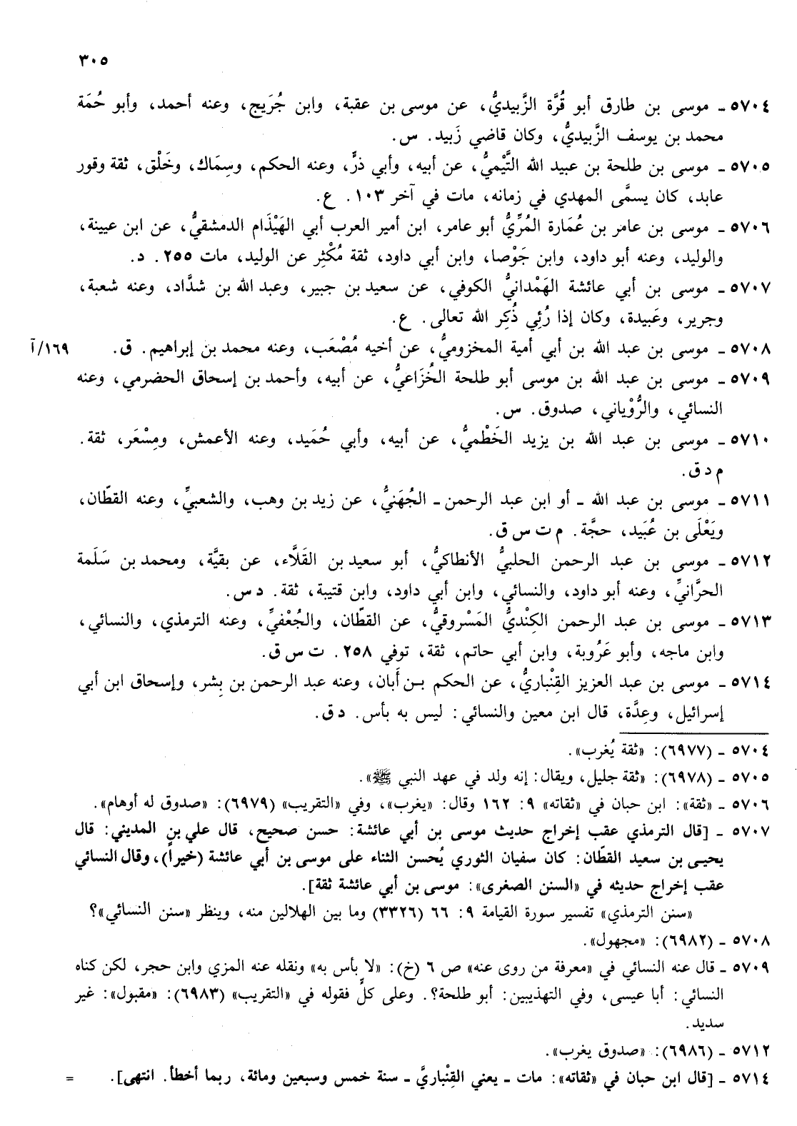5713- موسى بن عبد الرحمن الكندي المسروقي عن القطان والجعفي وعنه الترمذي والنسائي وابن ماجة وأبو عروبة وابن أبي حاتم ثقة توفي 258 ت س ق