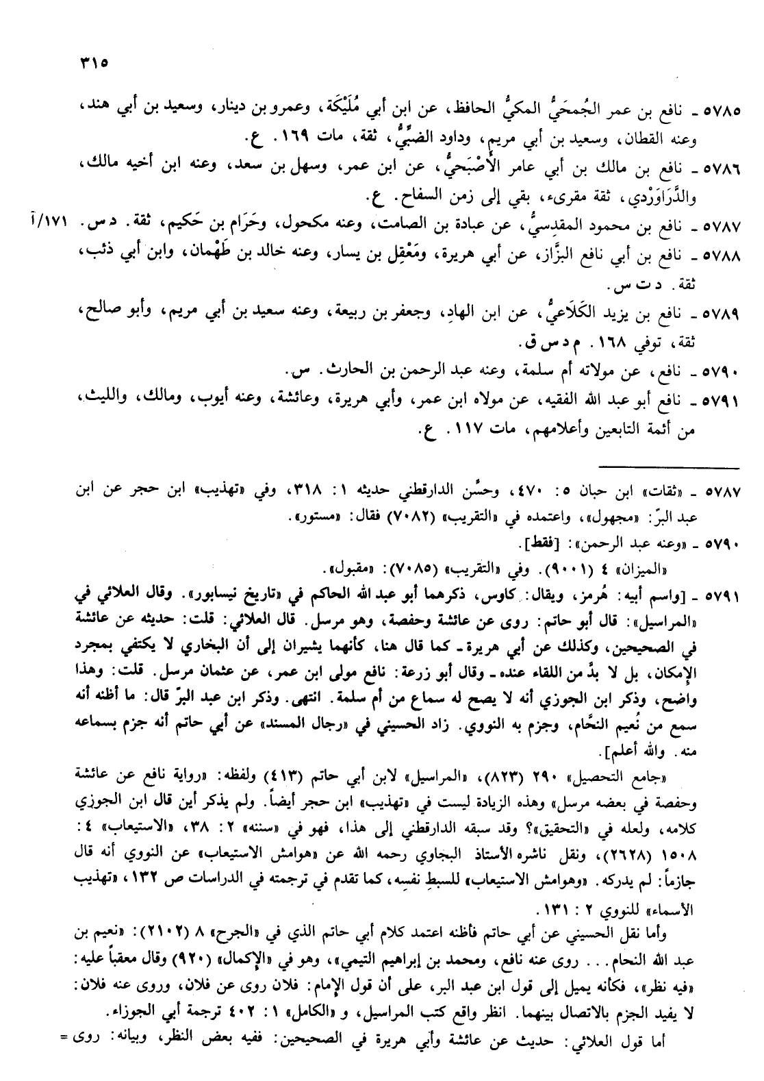 5791- نافع أبو عبد الله الفقيه عن مولاه بن عمر وأبي هريرة وعائشة وعنه أيوب ومالك والليث من أئمة التابعين وأعلامهم مات 117 ع