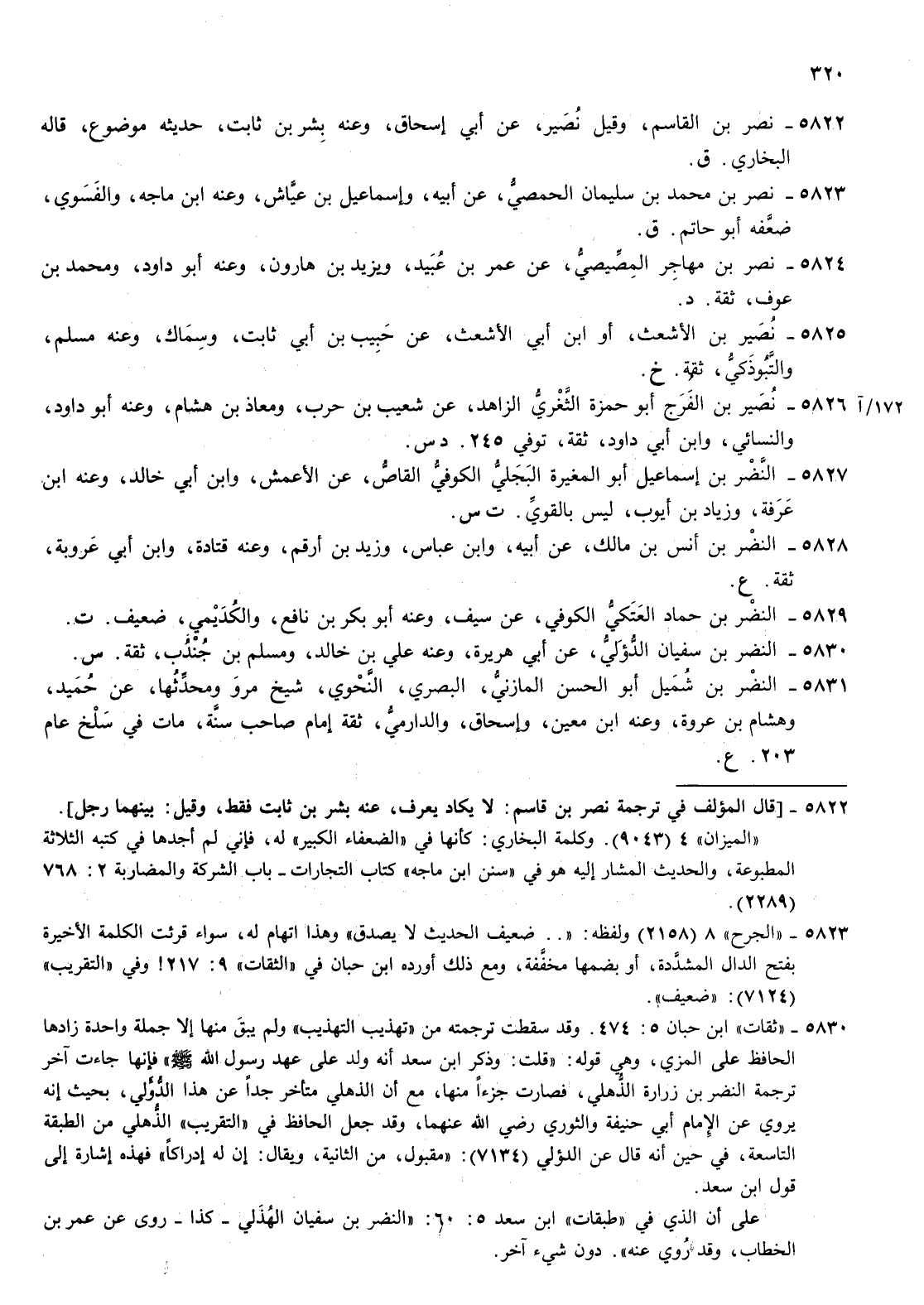 5831- النضر بن شميل أبو الحسن المازني البصري النحوي شيخ مرو ومحدثها عن حميد وهشام بن عروة وعنه بن معين وإسحاق والدارمي ثقة إمام صاحب سنة مات في سلخ عام 203 ع