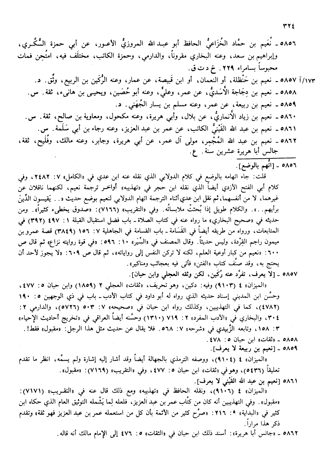 5856- نعيم بن حماد الخزاعي الحافظ أبو عبد الله المروزي الاعور عن أبي حمزة السكري وإبراهيم بن سعد وعنه البخاري مقرونا والدارمي وحمزة الكاتب مختلف فيه امتحن فمات محبوسا بسامراء 229 خ د ت ق