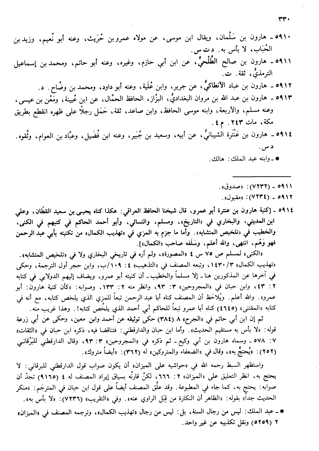 5913- هارون بن عبد الله بن مروان البغدادي البزاز الحافظ الحمال عن بن عيينة ومعن بن عيسى وعنه مسلم والاربعة وابنه موسى الحافظ وابن صاعد ثقة حمل رجلا على ظهره انقطع بطريق مكة مات 243 م 4