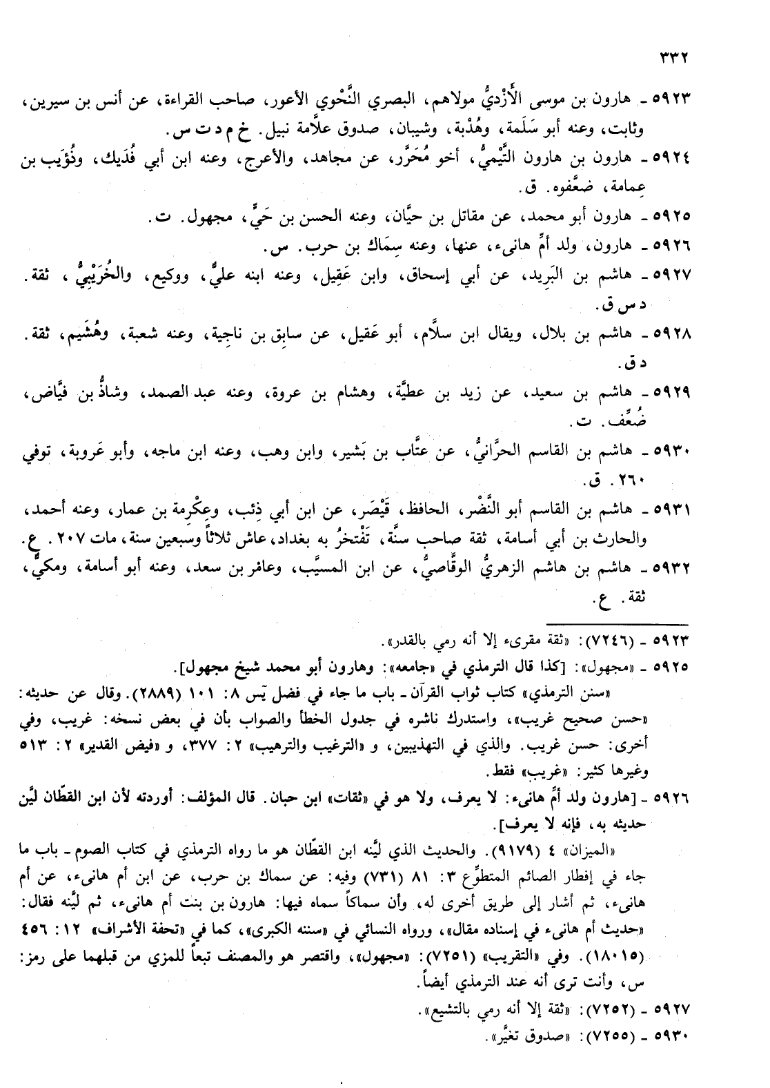 5923- هارون بن موسى الازدي مولاهم البصري النحوي الاعور صاحب القراءة عن أنس بن سيرين وثابت وعنه أبو سلمة وهدبة وشيبان صدوق علامة نبيل خ م د ت س