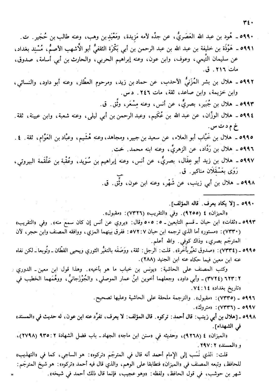 5992- هلال بن بشر المزني الاحدب عن حماد بن زيد ومرحوم العطار وعنه أبو داود والنسائي وابن خزيمة وابن صاعد ثقة مات 246 د س